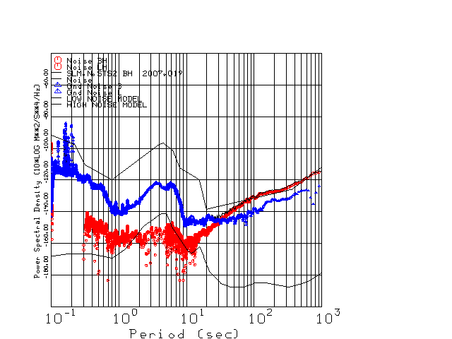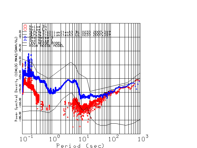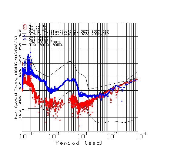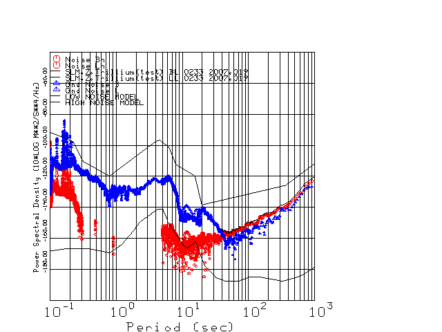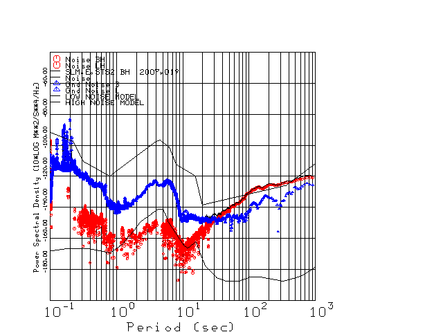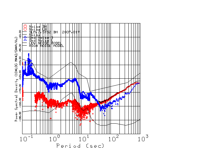 This page presents the results for Day 019 2007 and a direct comparison of the STS-2 to Trillium SN 0233 L channel). because of low teleseismic activity. 17 data segments are usually taken hourly starting at 0000 through 1700. 8192 time samples are used (~90 sec for 20 sps data stream) and 8192 sec for the 1 sps data stream. The noise results from the 20Hz and 1Hz data streams overlap at a 10 second period.
