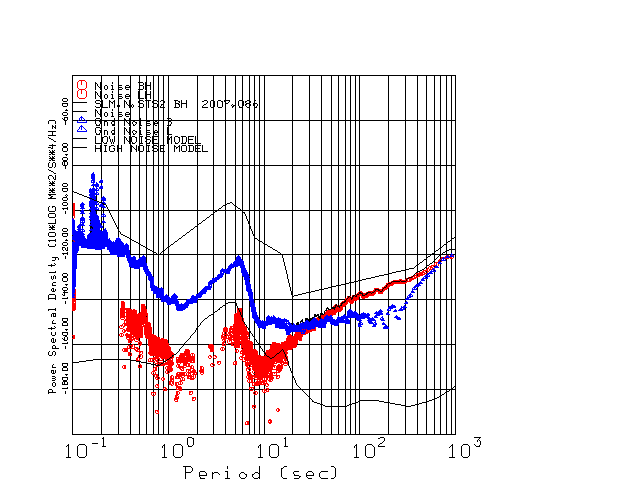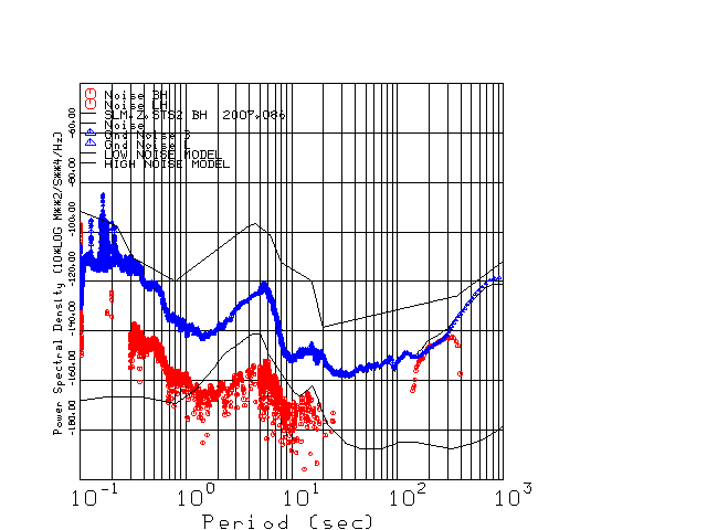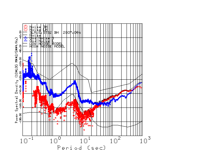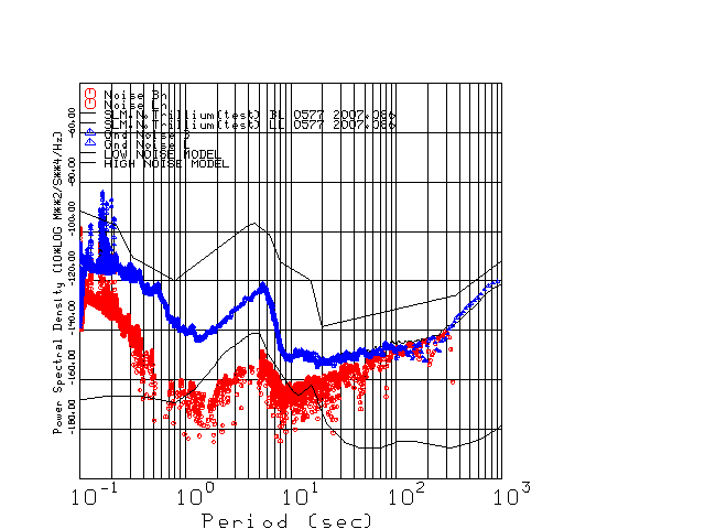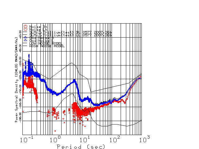 This page presents the results for Day 086 2007 and a direct comparison of the STS-2 to Trillium SN 0577 L channel). because of low teleseismic activity. 17 data segments are usually taken hourly starting at 0000 through 1700. 8192 time samples are used (~90 sec for 20 sps data stream) and 8192 sec for the 1 sps data stream. The noise results from the 20Hz and 1Hz data streams overlap at a 10 second period.