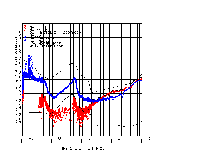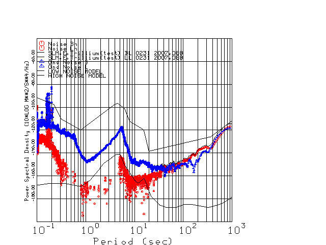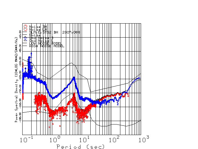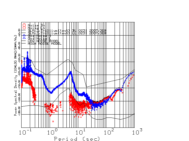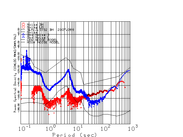 This page presents the results for Day 088 2007 and a direct comparison of the STS-2 to Trillium SN 0231 L channel). because of low teleseismic activity. 17 data segments are usually taken hourly starting at 0000 through 1700. 8192 time samples are used (~90 sec for 20 sps data stream) and 8192 sec for the 1 sps data stream. The noise results from the 20Hz and 1Hz data streams overlap at a 10 second period.