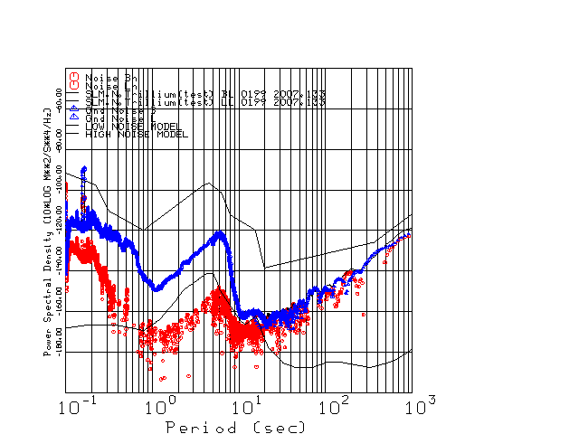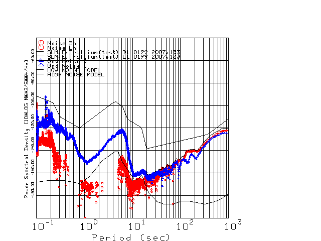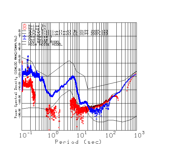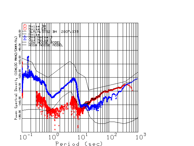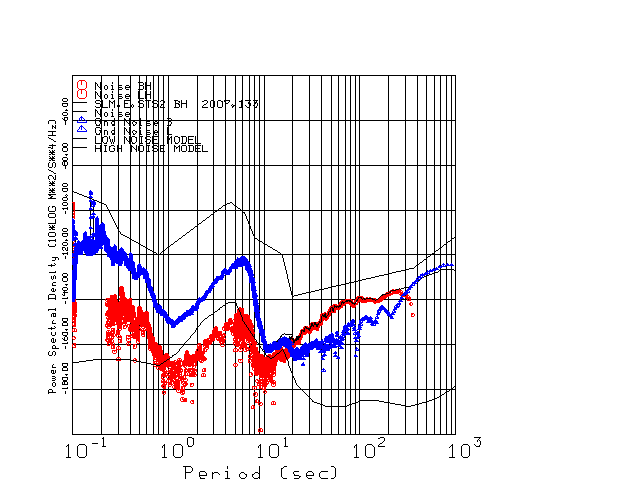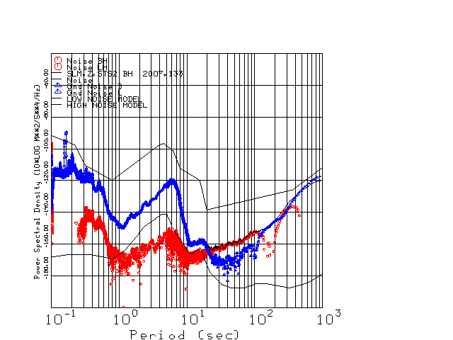 This page presents the results for Day 133 2007 and a direct comparison of the STS-2 to Trillium SN 0199 L channel). because of low teleseismic activity. 17 data segments are usually taken hourly starting at 0000 through 1700. 8192 time samples are used (~90 sec for 20 sps data stream) and 8192 sec for the 1 sps data stream. The noise results from the 20Hz and 1Hz data streams overlap at a 10 second period.