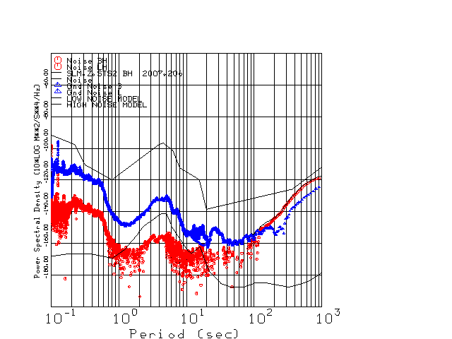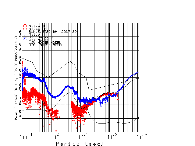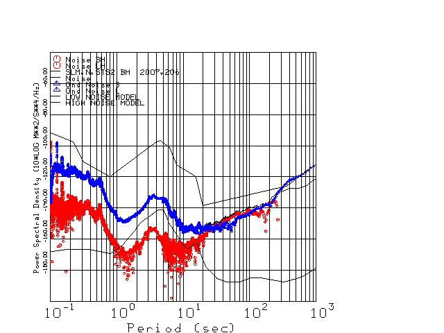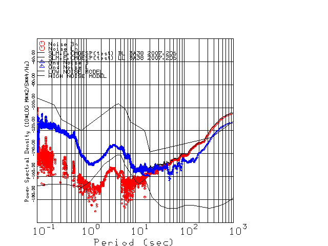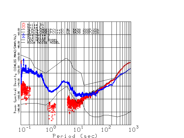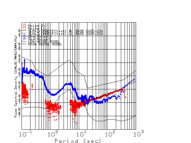 This page presents the results for Day 206 2007 and a direct comparison of the STS-2 to CMG3-ESP SN 3A38 L channel). because of low teleseismic activity. 17 data segments are usually taken hourly starting at 0000 through 1700. 8192 time samples are used (~90 sec for 20 sps data stream) and 8192 sec for the 1 sps data stream. The noise results from the 20Hz and 1Hz data streams overlap at a 10 second period.