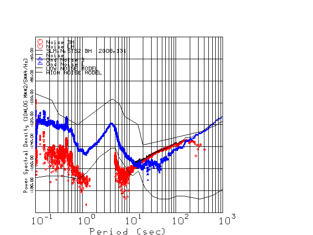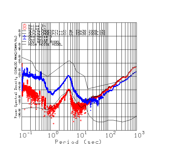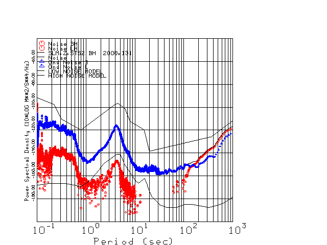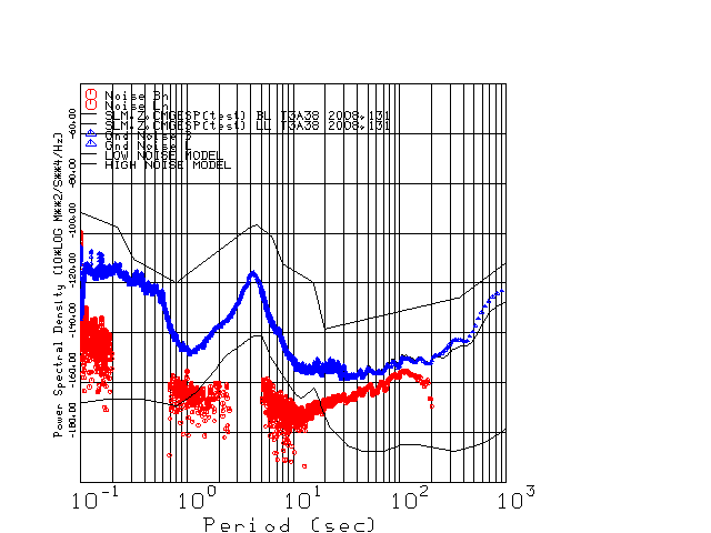 This page presents the results for Day 131 2008 and a direct comparison of the STS-2 to CMG3-ESP SN T3A38 L channel). because of low teleseismic activity. 17 data segments are usually taken hourly starting at 0000 through 1700. 8192 time samples are used (~90 sec for 20 sps data stream) and 8192 sec for the 1 sps data stream. The noise results from the 20Hz and 1Hz data streams overlap at a 10 second period.