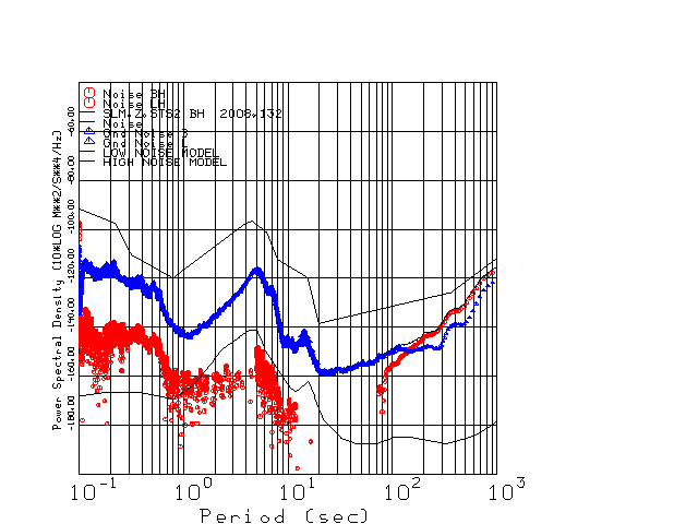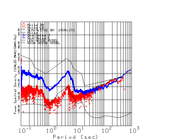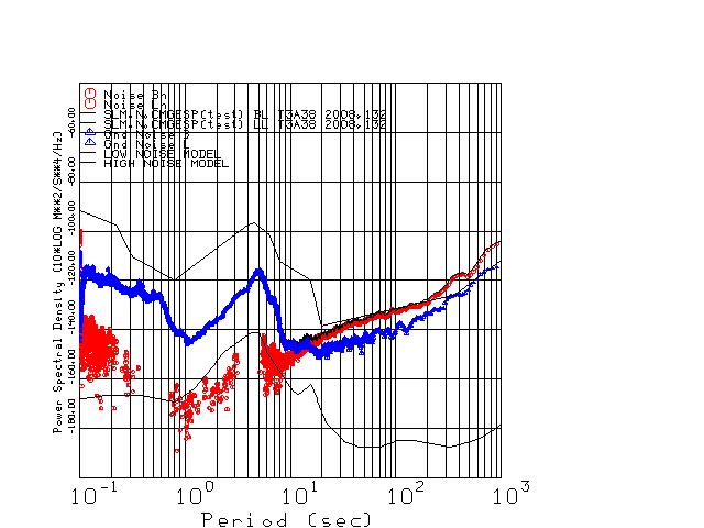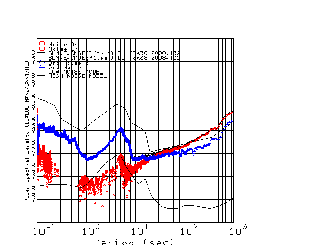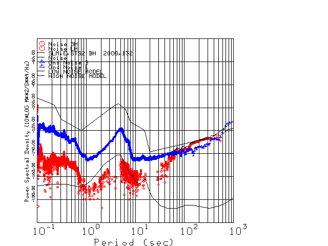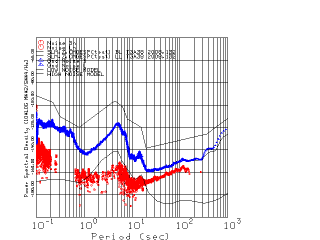 This page presents the results for Day 132 2008 and a direct comparison of the STS-2 to CMG3-ESP SN T3A38 L channel). because of low teleseismic activity. 17 data segments are usually taken hourly starting at 0000 through 1700. 8192 time samples are used (~90 sec for 20 sps data stream) and 8192 sec for the 1 sps data stream. The noise results from the 20Hz and 1Hz data streams overlap at a 10 second period.