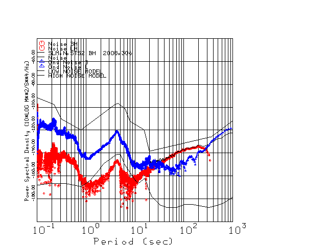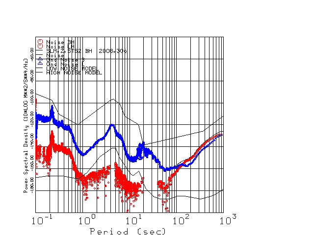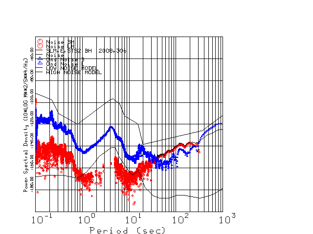This page presents the results for Day 306 2008 and a direct comparison of the STS-2 to CMG3-ESP SN 3663 L channel). because of low teleseismic activity. 17 data segments are usually taken hourly starting at 0000 through 1700. 8192 time samples are used (~90 sec for 20 sps data stream) and 8192 sec for the 1 sps data stream. The noise results from the 20Hz and 1Hz data streams overlap at a 10 second period.