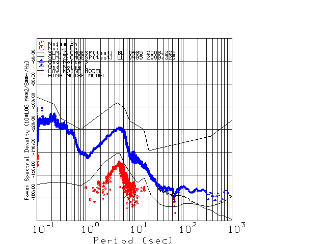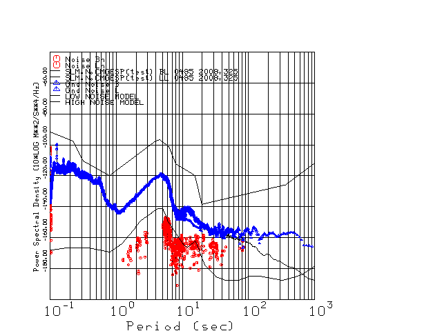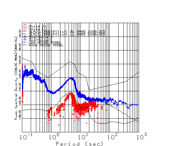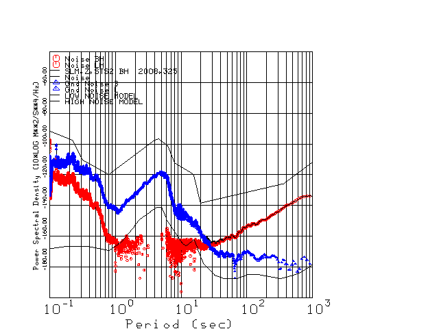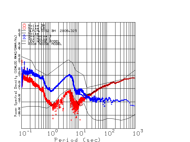 This page presents the results for Day 325 2008 and a direct comparison of the STS-2 to Trillium120P SN 0485 L channel). because of low teleseismic activity. 17 data segments are usually taken hourly starting at 0000 through 1700. 8192 time samples are used (~90 sec for 20 sps data stream) and 8192 sec for the 1 sps data stream. The noise results from the 20Hz and 1Hz data streams overlap at a 10 second period.