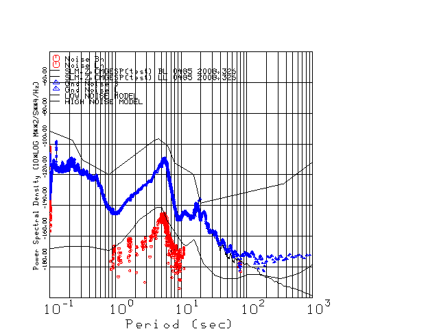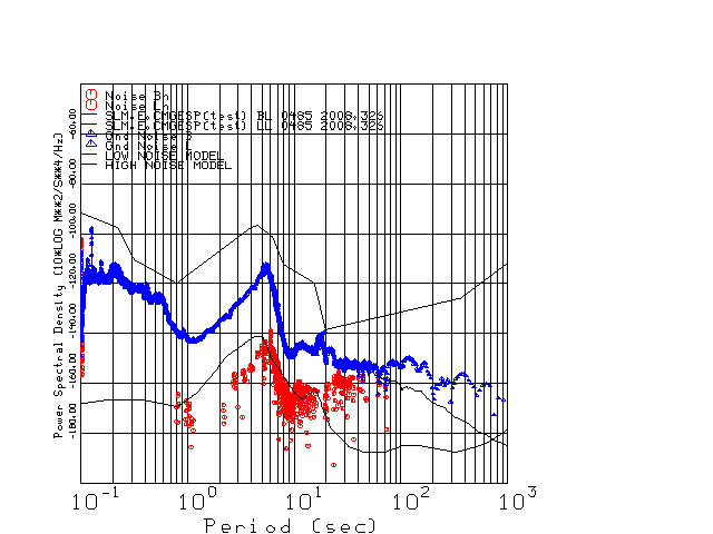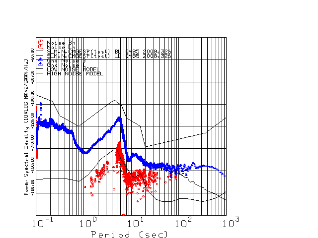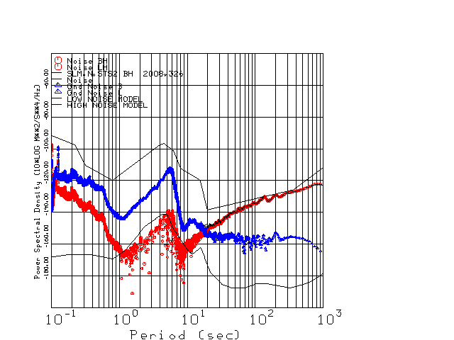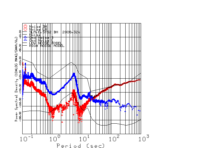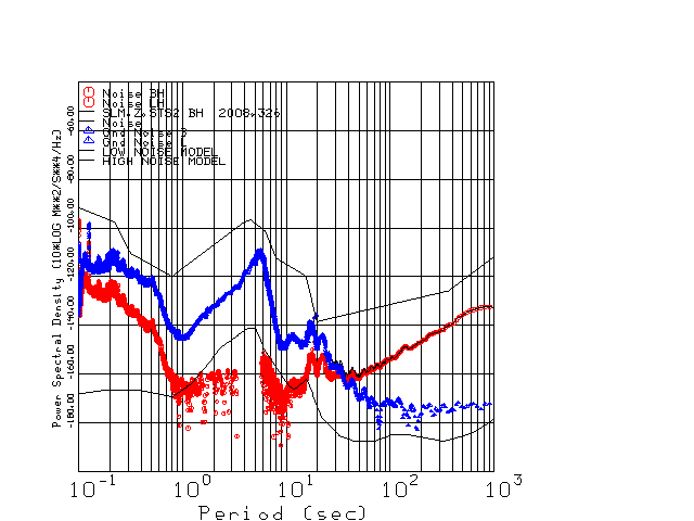 This page presents the results for Day 326 2008 and a direct comparison of the STS-2 to Trillium120P SN 0485 L channel). because of low teleseismic activity. 17 data segments are usually taken hourly starting at 0000 through 1700. 8192 time samples are used (~90 sec for 20 sps data stream) and 8192 sec for the 1 sps data stream. The noise results from the 20Hz and 1Hz data streams overlap at a 10 second period.