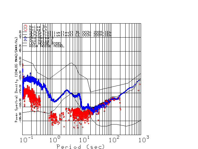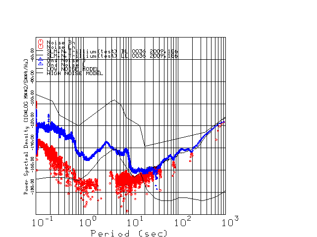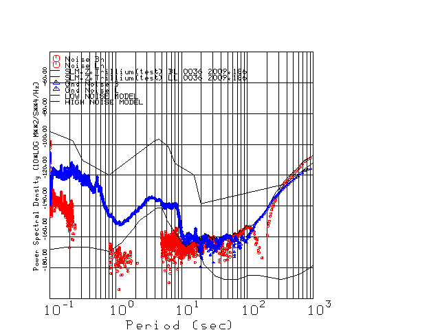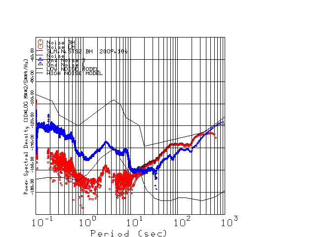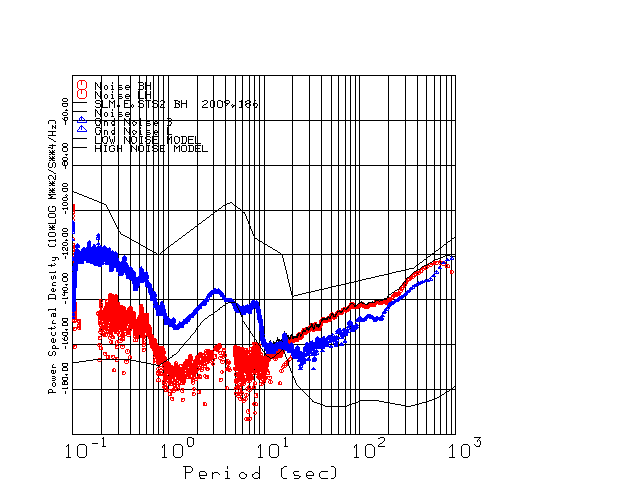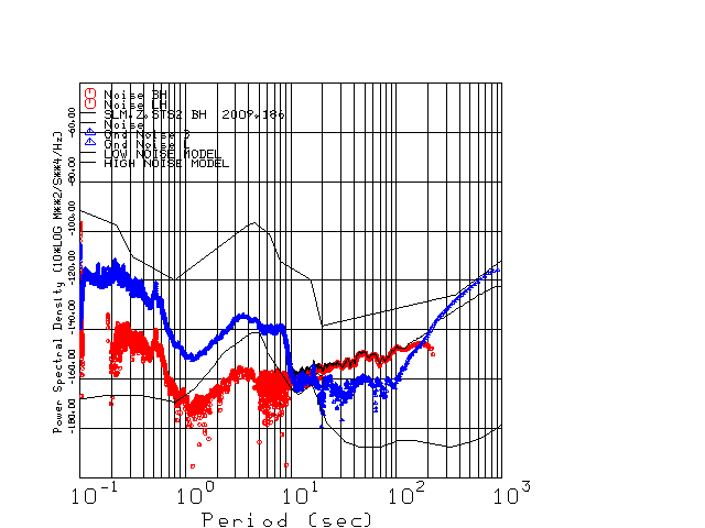 This page presents the results for Day 186 2009 and a direct comparison of the STS-2 to Trillium SN 0036 L channel). because of low teleseismic activity. 17 data segments are usually taken hourly starting at 0000 through 1700. 8192 time samples are used (~90 sec for 20 sps data stream) and 8192 sec for the 1 sps data stream. The noise results from the 20Hz and 1Hz data streams overlap at a 10 second period.