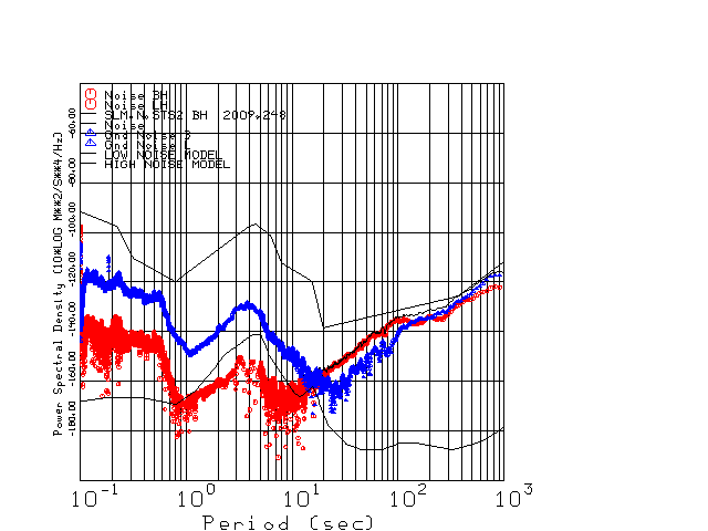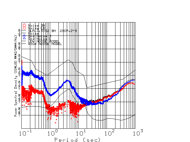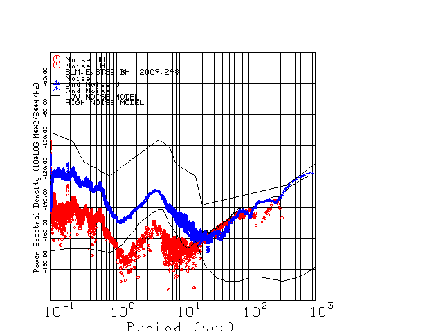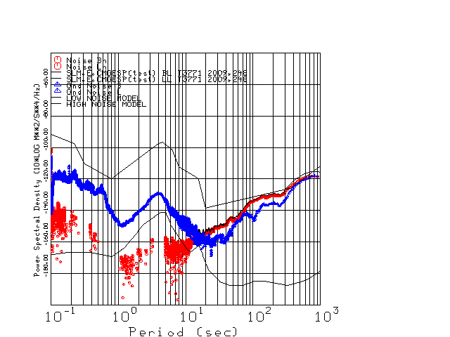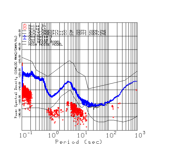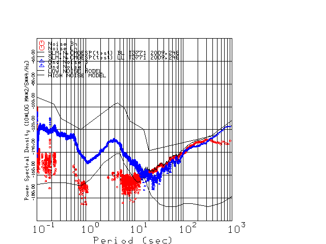 This page presents the results for Day 248 2009 and a direct comparison of the STS-2 to CMG3-ESP SN T3771 L channel). because of low teleseismic activity. 17 data segments are usually taken hourly starting at 0000 through 1700. 8192 time samples are used (~90 sec for 20 sps data stream) and 8192 sec for the 1 sps data stream. The noise results from the 20Hz and 1Hz data streams overlap at a 10 second period.