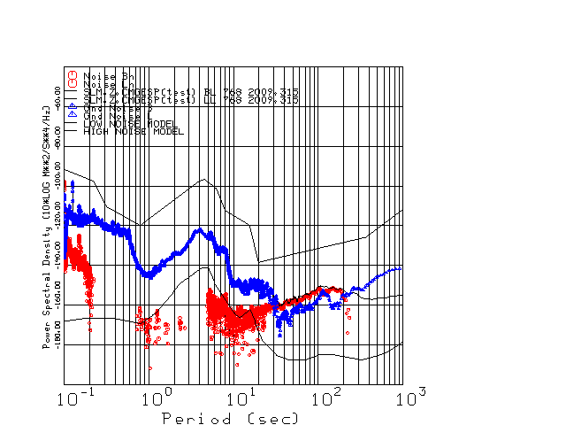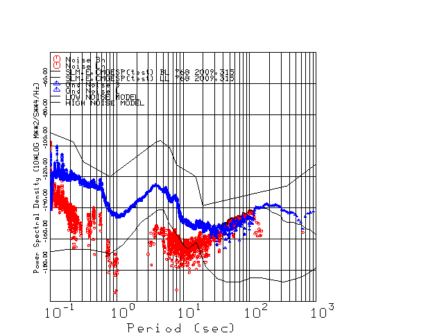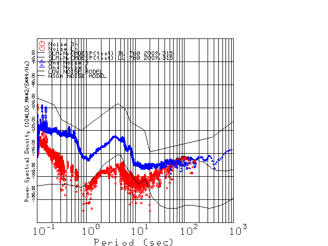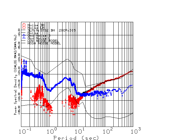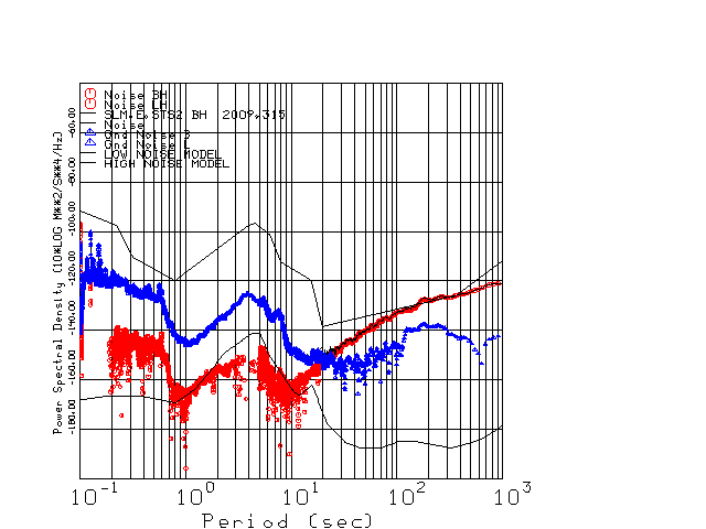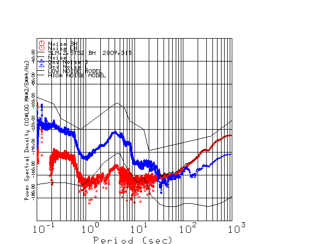 This page presents the results for Day 315 2009 and a direct comparison of the STS-2 to Trillium120P SN 768 L channel). because of low teleseismic activity. 17 data segments are usually taken hourly starting at 0000 through 1700. 8192 time samples are used (~90 sec for 20 sps data stream) and 8192 sec for the 1 sps data stream. The noise results from the 20Hz and 1Hz data streams overlap at a 10 second period.