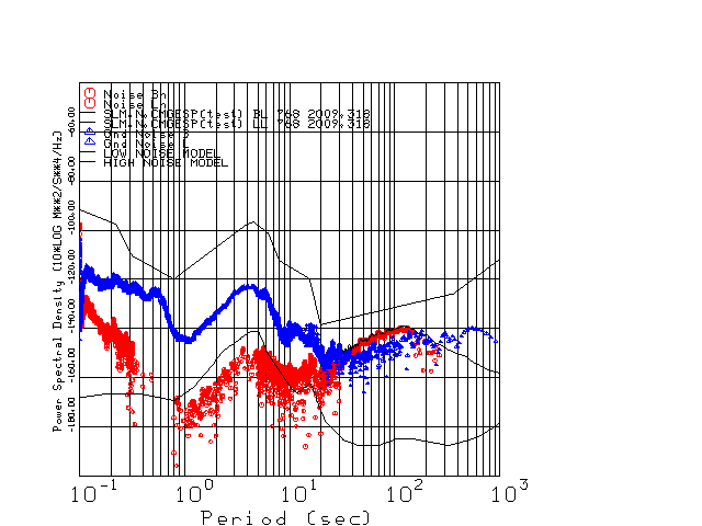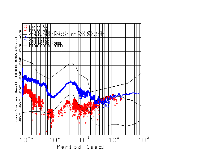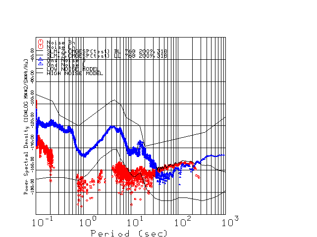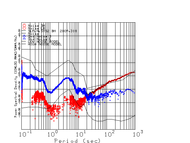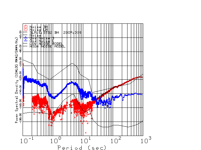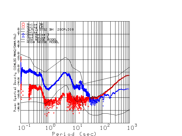 This page presents the results for Day 318 2009 and a direct comparison of the STS-2 to Trillium120P SN 768 L channel). because of low teleseismic activity. 17 data segments are usually taken hourly starting at 0000 through 1700. 8192 time samples are used (~90 sec for 20 sps data stream) and 8192 sec for the 1 sps data stream. The noise results from the 20Hz and 1Hz data streams overlap at a 10 second period.