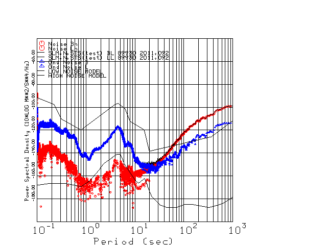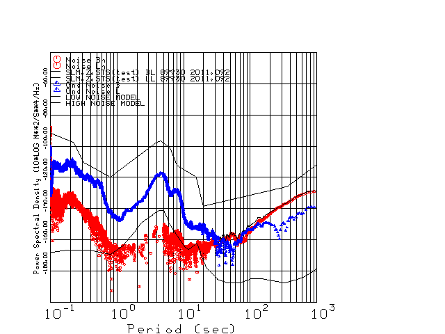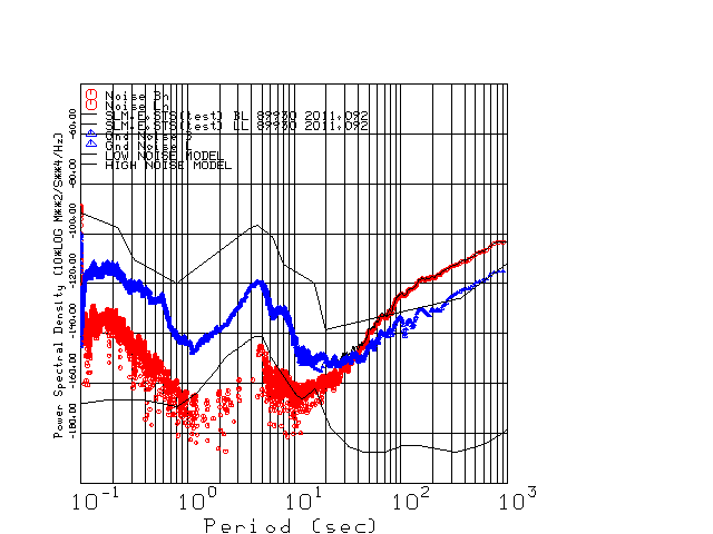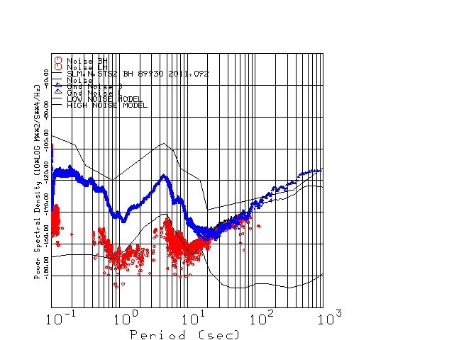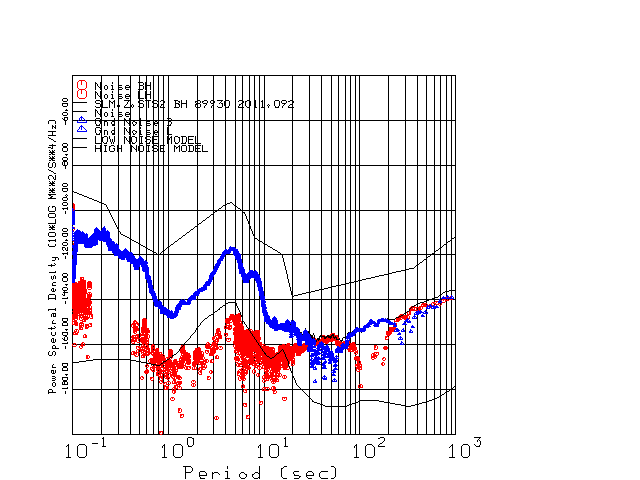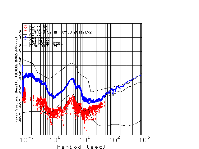 This page presents the results for Day 092 2011 and a direct comparison of the STS-2 to STS2 SN 89930 L channel). because of low teleseismic activity. 17 data segments are usually taken hourly starting at 0000 through 1700. 8192 time samples are used (~90 sec for 20 sps data stream) and 8192 sec for the 1 sps data stream. The noise results from the 20Hz and 1Hz data streams overlap at a 10 second period.