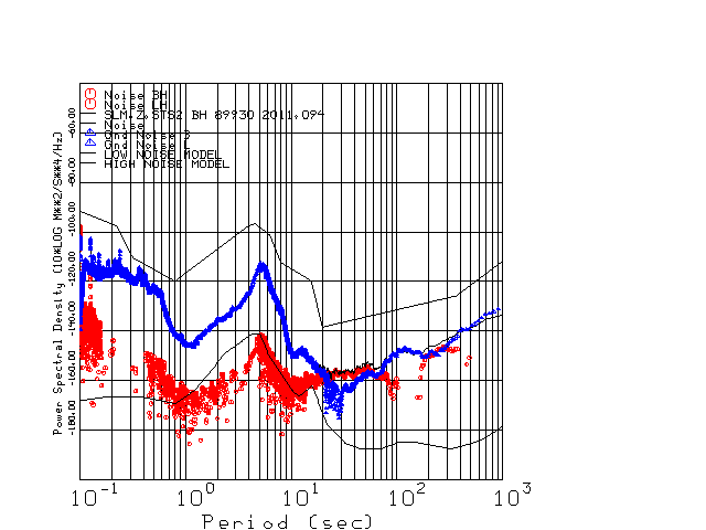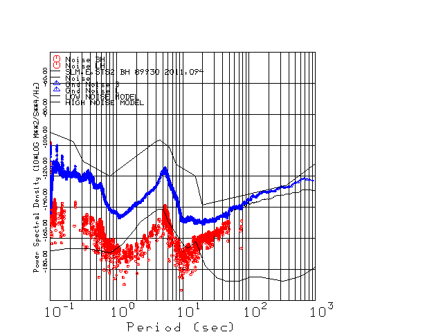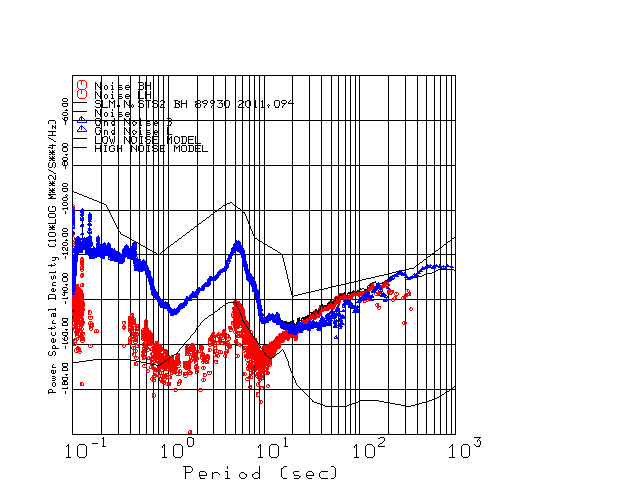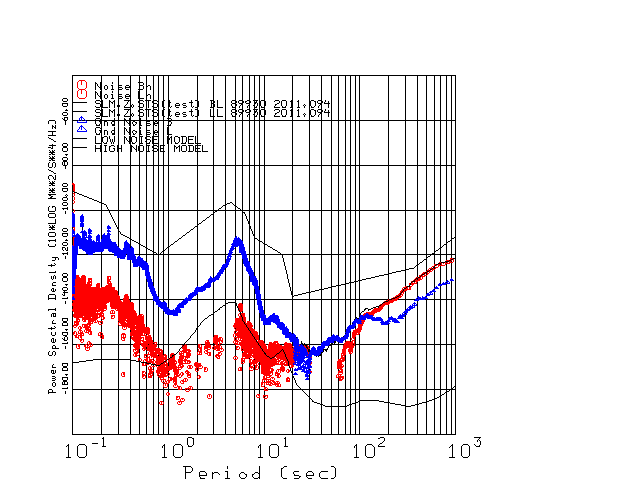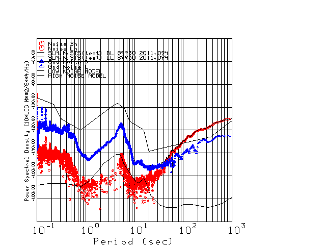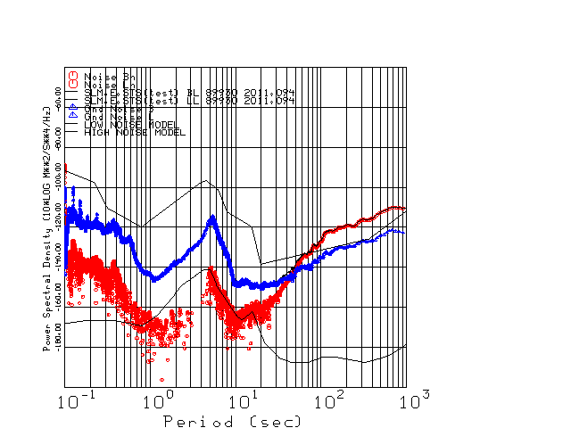 This page presents the results for Day 094 2011 and a direct comparison of the STS-2 to STS2 SN 89930 L channel). because of low teleseismic activity. 17 data segments are usually taken hourly starting at 0000 through 1700. 8192 time samples are used (~90 sec for 20 sps data stream) and 8192 sec for the 1 sps data stream. The noise results from the 20Hz and 1Hz data streams overlap at a 10 second period.