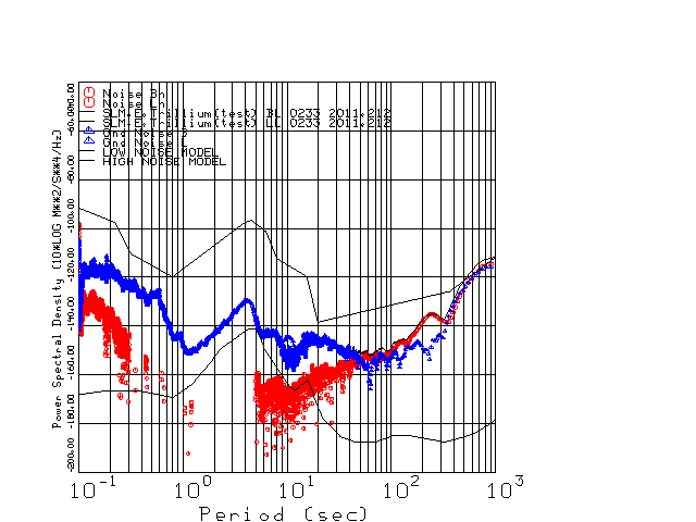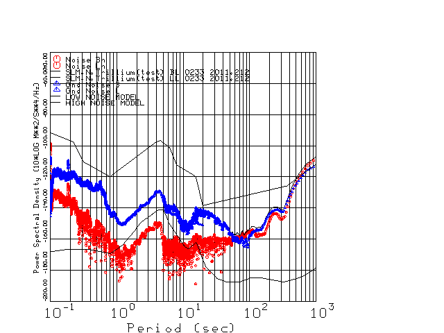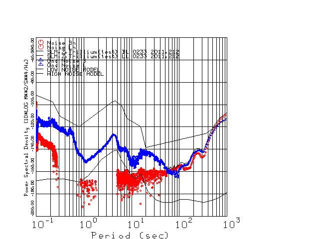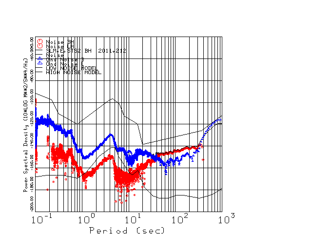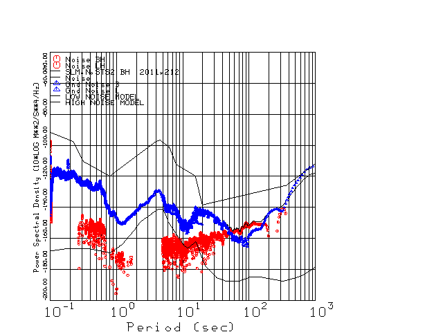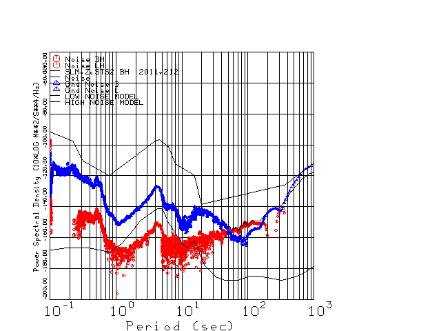 This page presents the results for Day 212 2011 and a direct comparison of the STS-2 to Trillium SN 0233 L channel). because of low teleseismic activity. 17 data segments are usually taken hourly starting at 0000 through 1700. 8192 time samples are used (~90 sec for 20 sps data stream) and 8192 sec for the 1 sps data stream. The noise results from the 20Hz and 1Hz data streams overlap at a 10 second period.