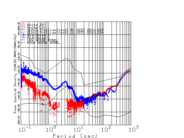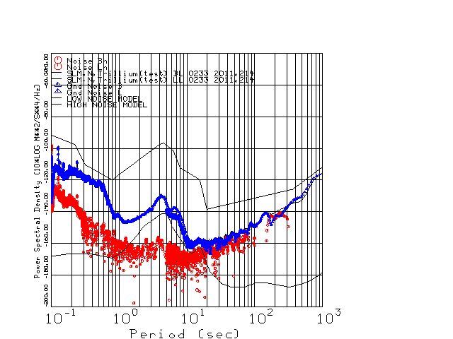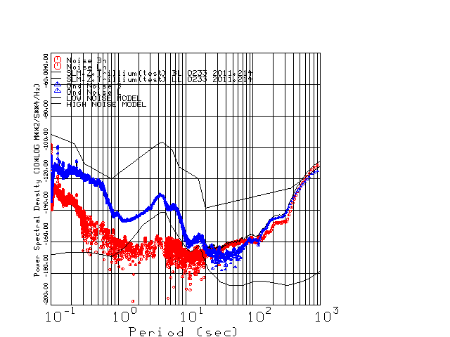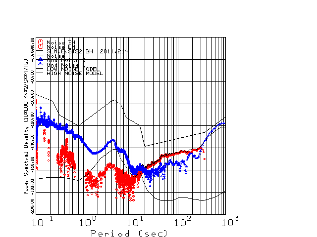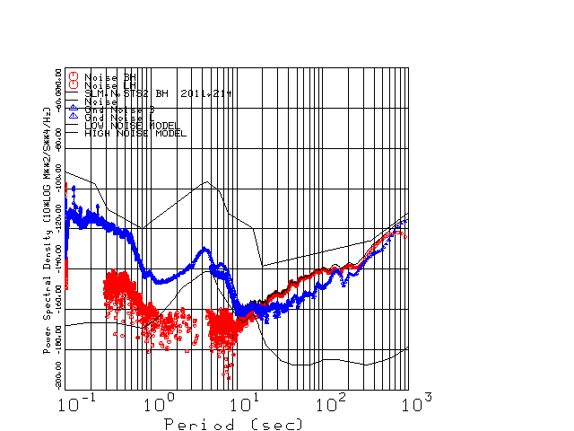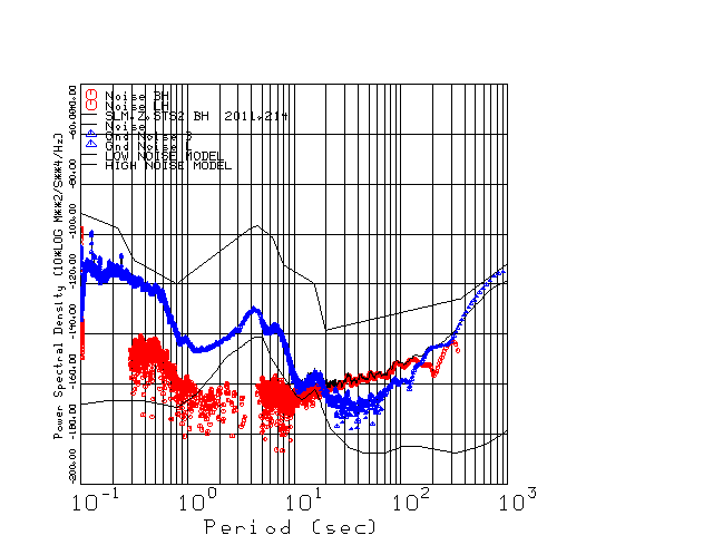This page presents the results for Day 214 2011 and a direct comparison of the STS-2 to Trillium SN 0233 L channel). because of low teleseismic activity. 17 data segments are usually taken hourly starting at 0000 through 1700. 8192 time samples are used (~90 sec for 20 sps data stream) and 8192 sec for the 1 sps data stream. The noise results from the 20Hz and 1Hz data streams overlap at a 10 second period.