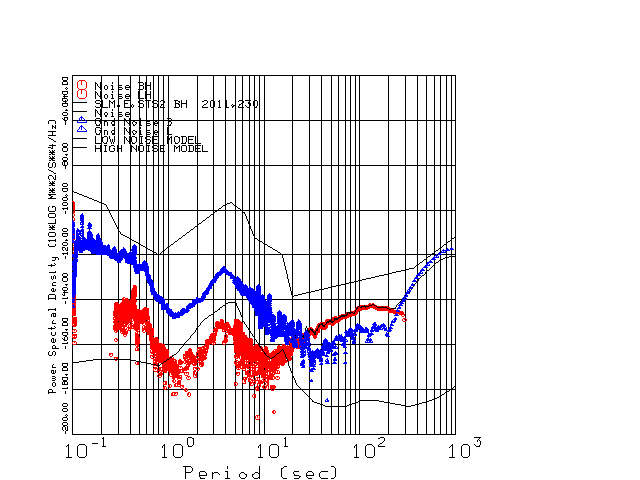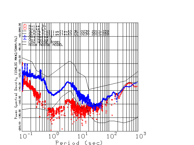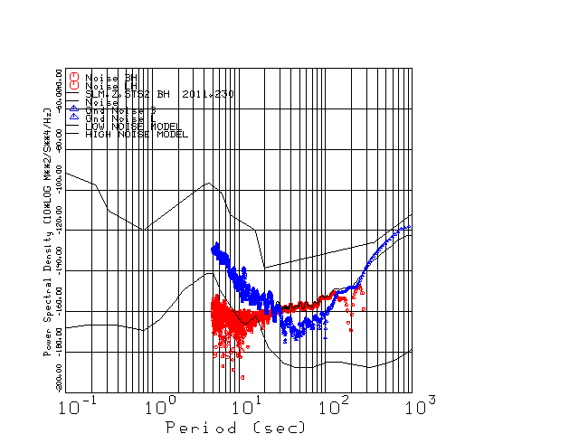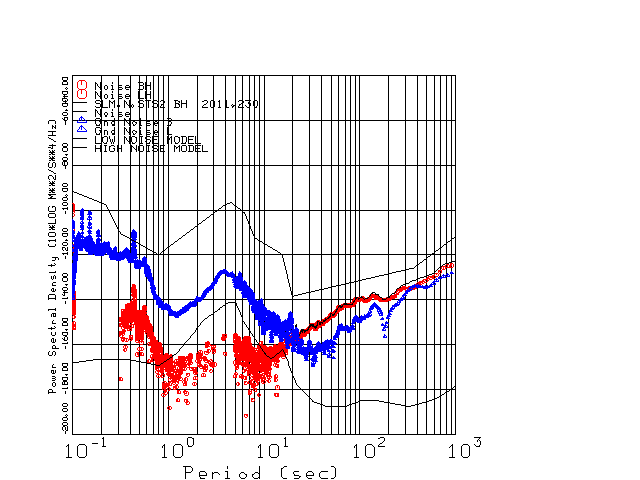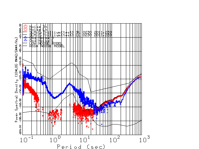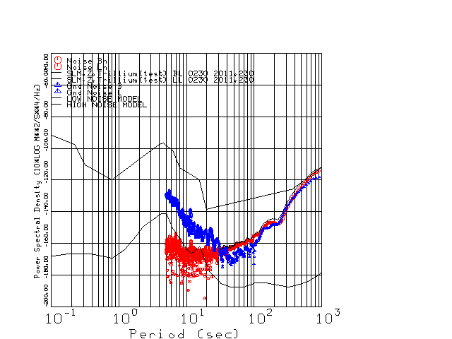 This page presents the results for Day 230 2011 and a direct comparison of the STS-2 to Trillium SN 0230 L channel). because of low teleseismic activity. 17 data segments are usually taken hourly starting at 0000 through 1700. 8192 time samples are used (~90 sec for 20 sps data stream) and 8192 sec for the 1 sps data stream. The noise results from the 20Hz and 1Hz data streams overlap at a 10 second period.