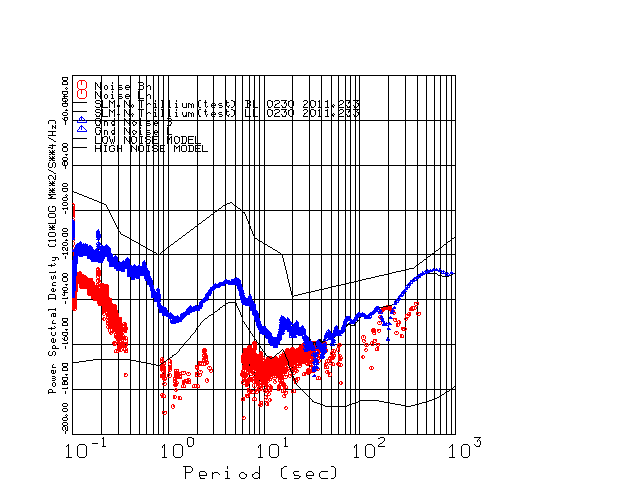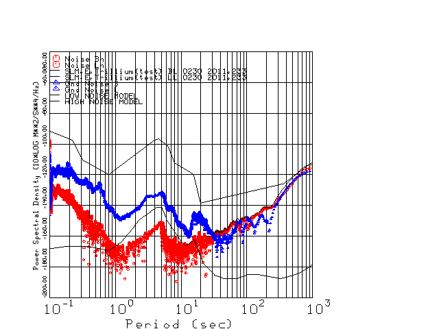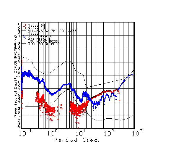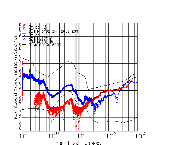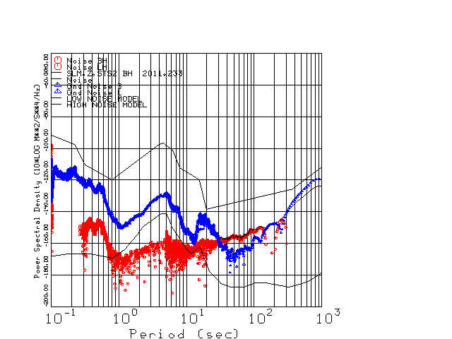 This page presents the results for Day 233 2011 and a direct comparison of the STS-2 to Trillium SN 0230 L channel). because of low teleseismic activity. 17 data segments are usually taken hourly starting at 0000 through 1700. 8192 time samples are used (~90 sec for 20 sps data stream) and 8192 sec for the 1 sps data stream. The noise results from the 20Hz and 1Hz data streams overlap at a 10 second period.