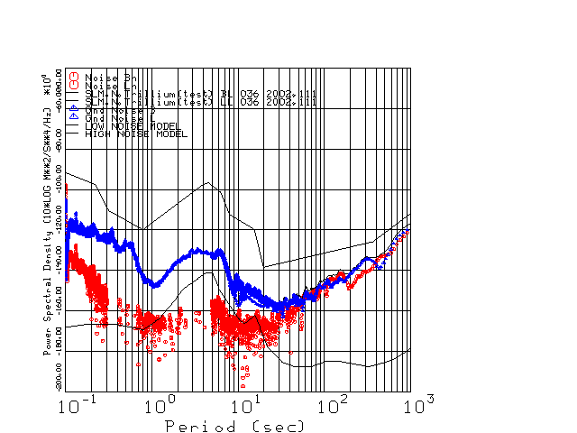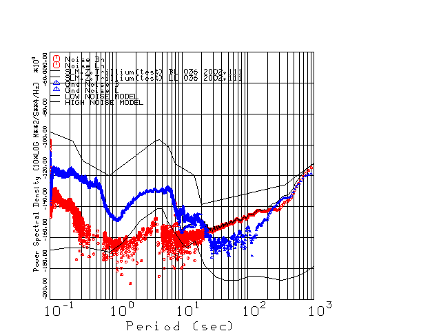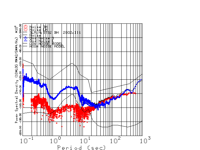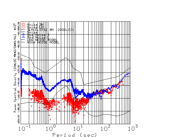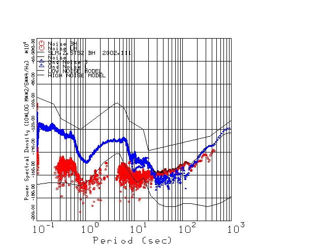 This page presents the results for Day 111 2002 and a direct comparison of the STS-2 to Trillium SN 036 L channel). because of low teleseismic activity. 17 data segments are usually taken hourly starting at 0000 through 1700. 8192 time samples are used (~90 sec for 20 sps data stream) and 8192 sec for the 1 sps data stream. The noise results from the 20Hz and 1Hz data streams overlap at a 10 second period.