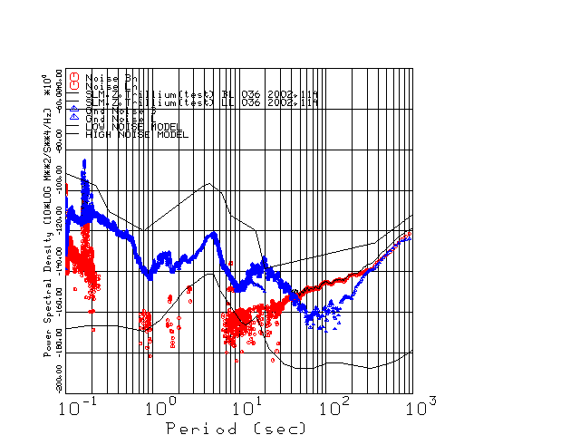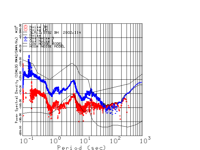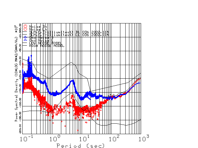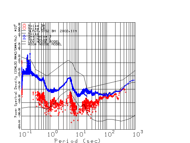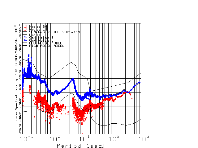 This page presents the results for Day 114 2002 and a direct comparison of the STS-2 to Trillium SN 036 L channel). because of low teleseismic activity. 17 data segments are usually taken hourly starting at 0000 through 1700. 8192 time samples are used (~90 sec for 20 sps data stream) and 8192 sec for the 1 sps data stream. The noise results from the 20Hz and 1Hz data streams overlap at a 10 second period.