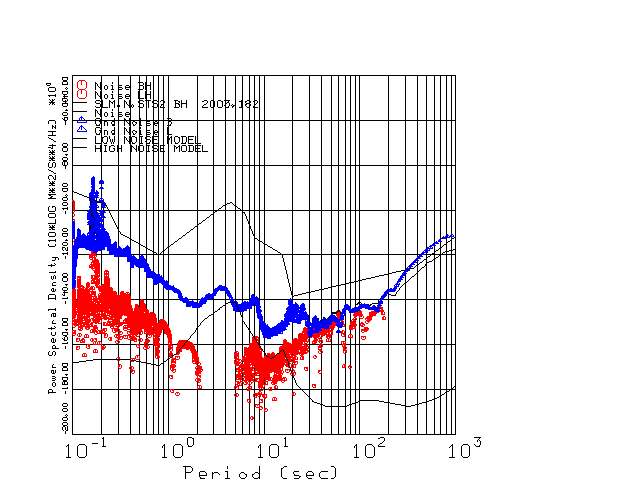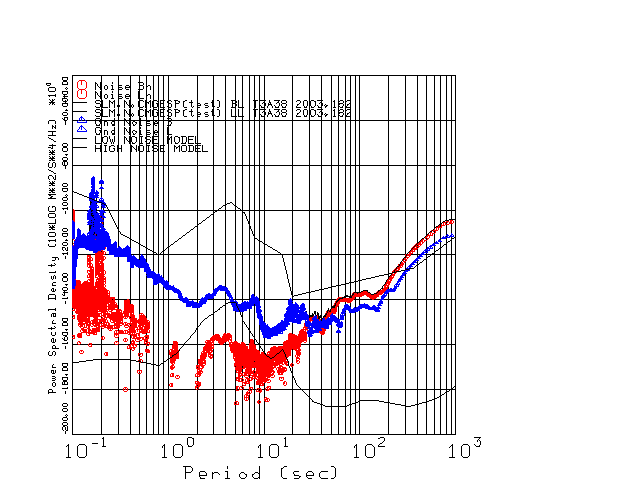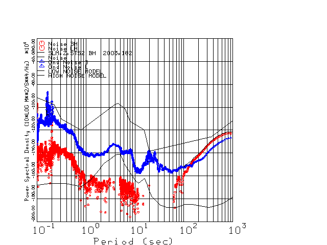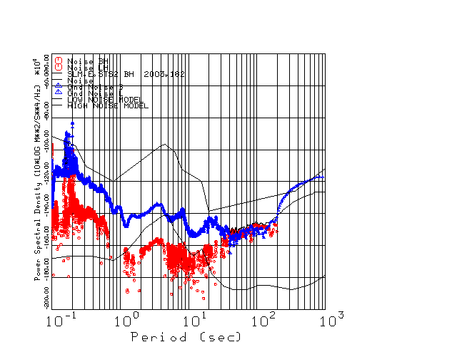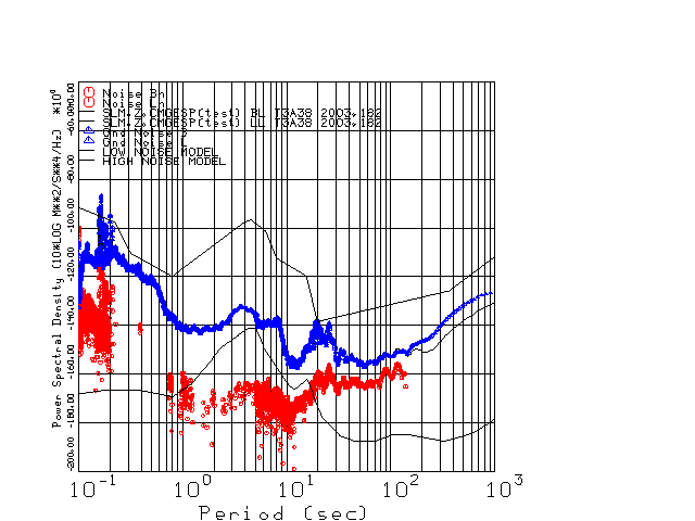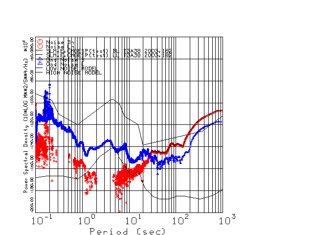 This page presents the results for Day 182 2003 and a direct comparison of the STS-2 to CMG3-ESP SN T3A38 L channel). because of low teleseismic activity. 17 data segments are usually taken hourly starting at 0000 through 1700. 8192 time samples are used (~90 sec for 20 sps data stream) and 8192 sec for the 1 sps data stream. The noise results from the 20Hz and 1Hz data streams overlap at a 10 second period.
