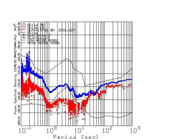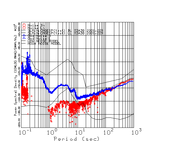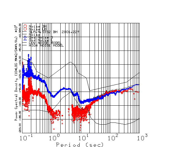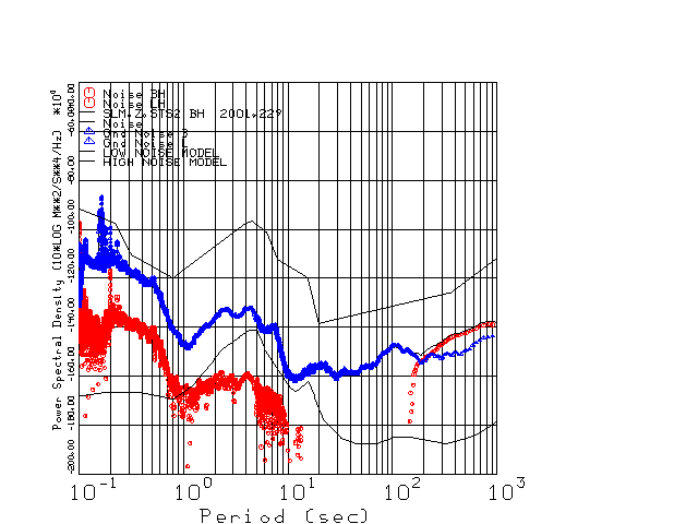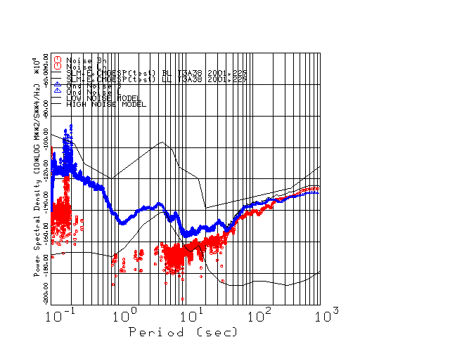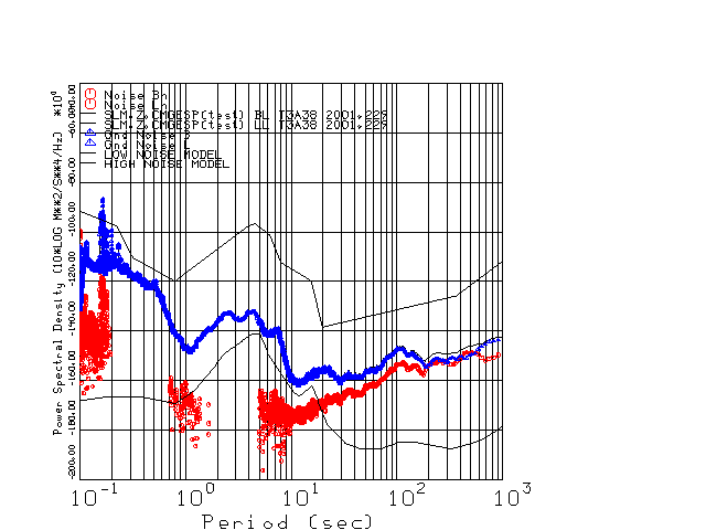 This page presents the results for Day 229 2001 and a direct comparison of the STS-2 to CMG3-ESP SN T3A38 L channel). because of low teleseismic activity. 17 data segments are usually taken hourly starting at 0000 through 1700. 8192 time samples are used (~90 sec for 20 sps data stream) and 8192 sec for the 1 sps data stream. The noise results from the 20Hz and 1Hz data streams overlap at a 10 second period.