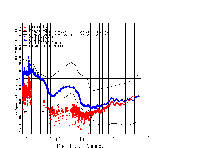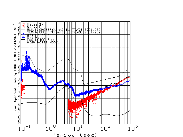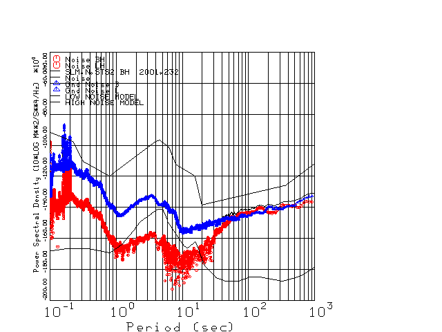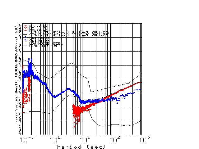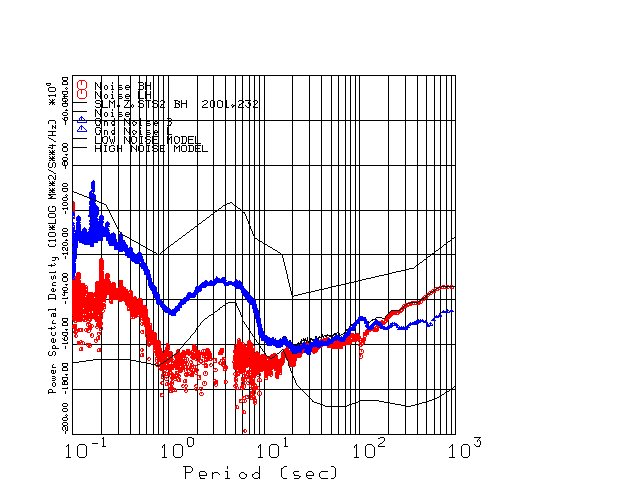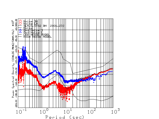 This page presents the results for Day 232 2001 and a direct comparison of the STS-2 to CMG3-ESP SN T3A38 L channel). because of low teleseismic activity. 17 data segments are usually taken hourly starting at 0000 through 1700. 8192 time samples are used (~90 sec for 20 sps data stream) and 8192 sec for the 1 sps data stream. The noise results from the 20Hz and 1Hz data streams overlap at a 10 second period.