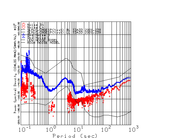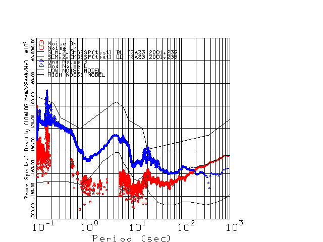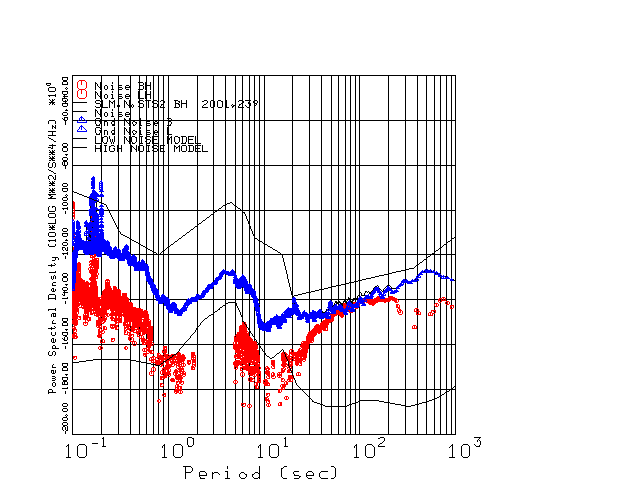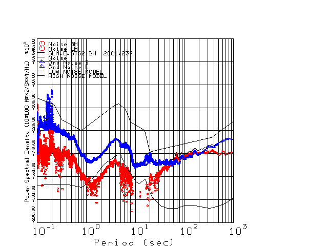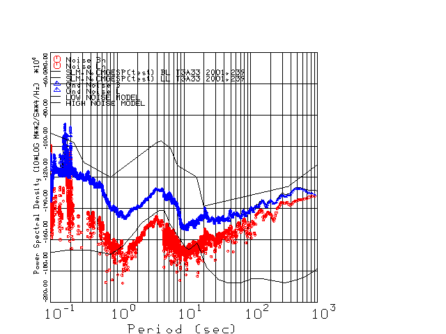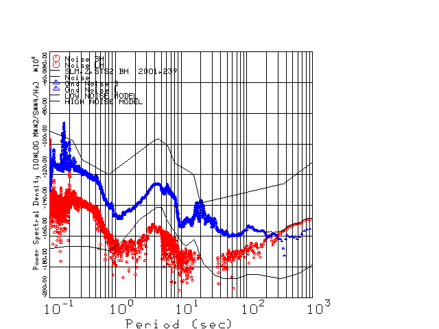 This page presents the results for Day 239 2001 and a direct comparison of the STS-2 to CMG3-ESP SN T3A33 L channel). because of low teleseismic activity. 17 data segments are usually taken hourly starting at 0000 through 1700. 8192 time samples are used (~90 sec for 20 sps data stream) and 8192 sec for the 1 sps data stream. The noise results from the 20Hz and 1Hz data streams overlap at a 10 second period.