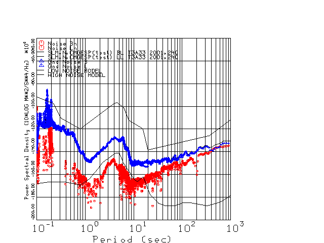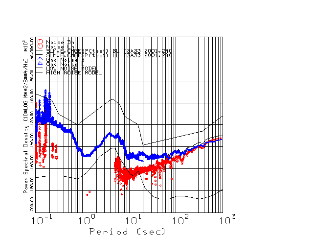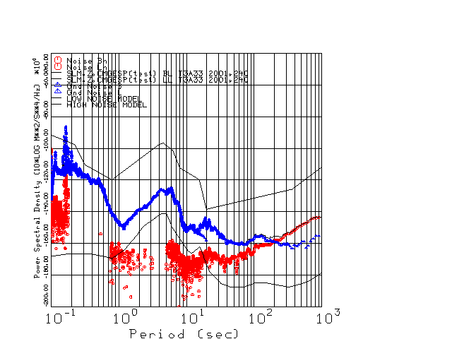 This page presents the results for Day 240 2001 and a direct comparison of the STS-2 to CMG3-ESP SN T3A33 L channel). because of low teleseismic activity. 17 data segments are usually taken hourly starting at 0000 through 1700. 8192 time samples are used (~90 sec for 20 sps data stream) and 8192 sec for the 1 sps data stream. The noise results from the 20Hz and 1Hz data streams overlap at a 10 second period.