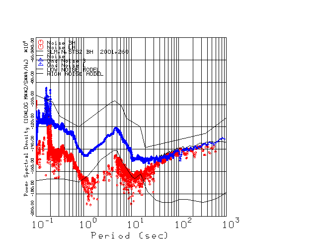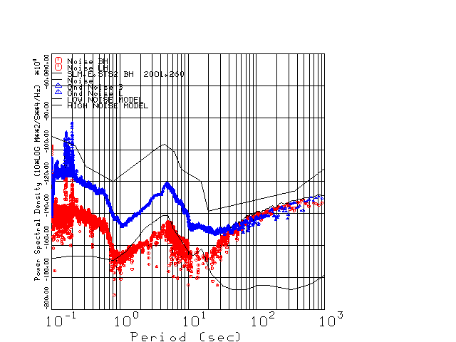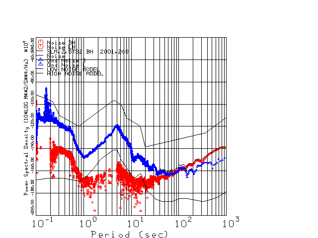 This page presents the results for Day 260 2001 and a direct comparison of the STS-2 to CMG3-ESP SN 3814 L channel). because of low teleseismic activity. 17 data segments are usually taken hourly starting at 0000 through 1700. 8192 time samples are used (~90 sec for 20 sps data stream) and 8192 sec for the 1 sps data stream. The noise results from the 20Hz and 1Hz data streams overlap at a 10 second period.