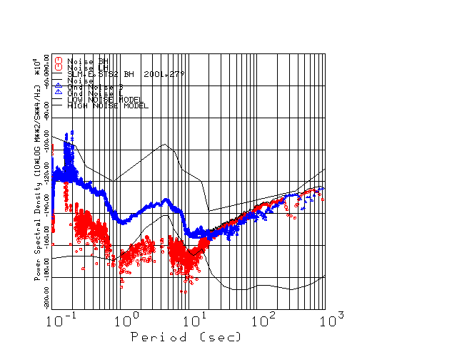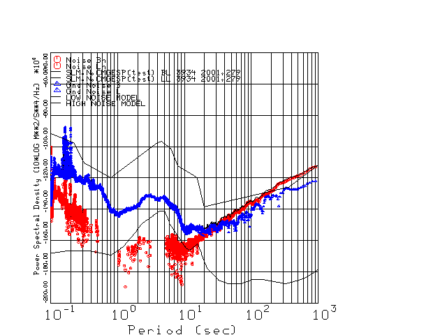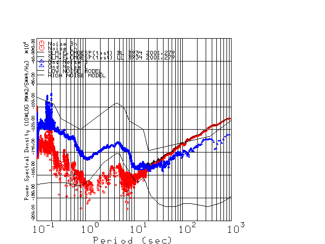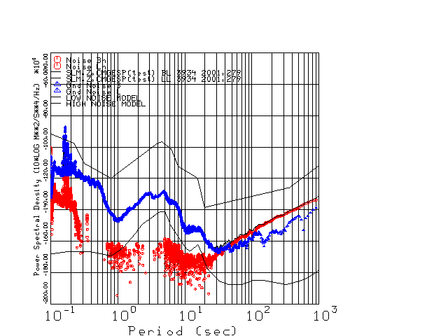 This page presents the results for Day 279 2001 and a direct comparison of the STS-2 to CMG3-ESP SN 3934 L channel). because of low teleseismic activity. 17 data segments are usually taken hourly starting at 0000 through 1700. 8192 time samples are used (~90 sec for 20 sps data stream) and 8192 sec for the 1 sps data stream. The noise results from the 20Hz and 1Hz data streams overlap at a 10 second period.