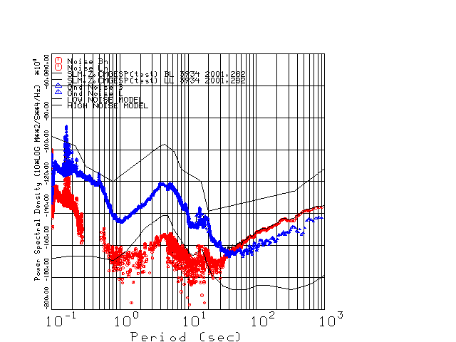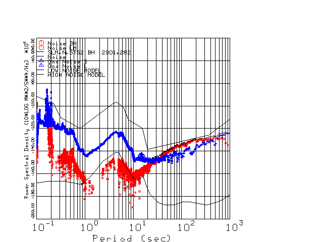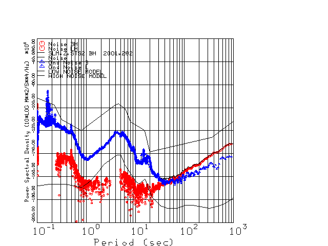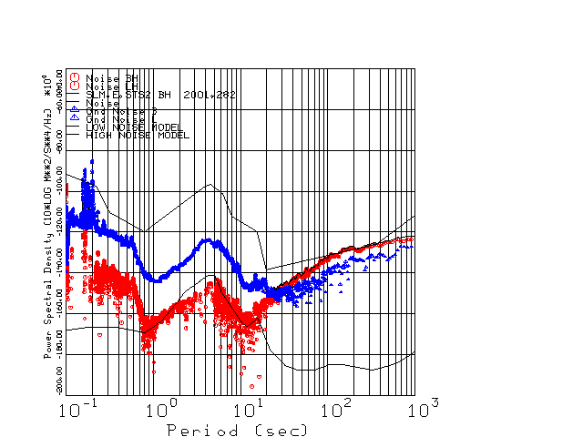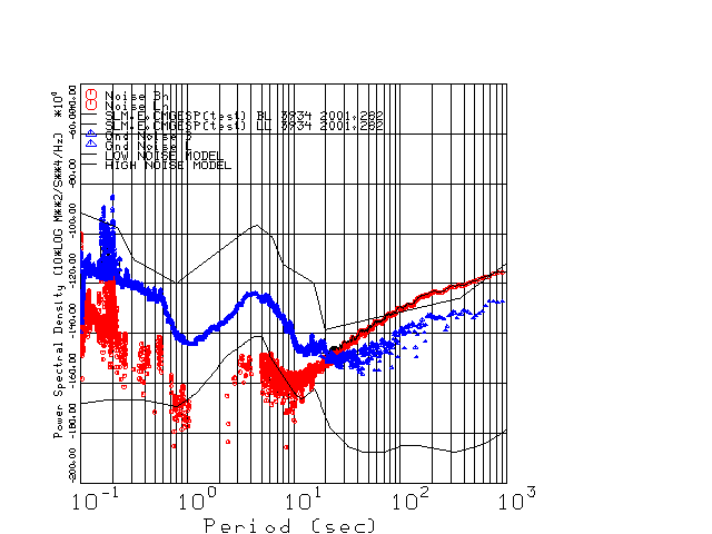 This page presents the results for Day 282 2001 and a direct comparison of the STS-2 to CMG3-ESP SN 3934 L channel). because of low teleseismic activity. 17 data segments are usually taken hourly starting at 0000 through 1700. 8192 time samples are used (~90 sec for 20 sps data stream) and 8192 sec for the 1 sps data stream. The noise results from the 20Hz and 1Hz data streams overlap at a 10 second period.