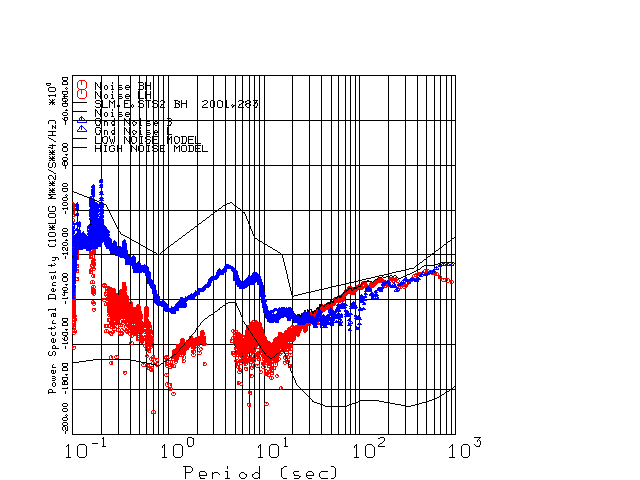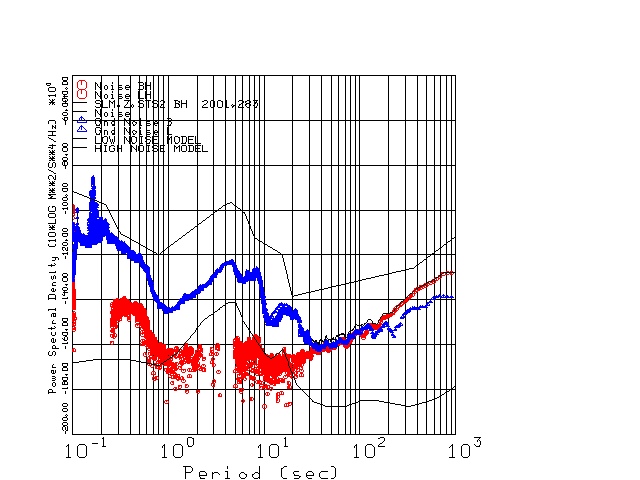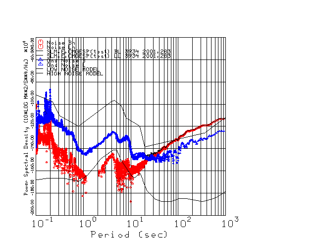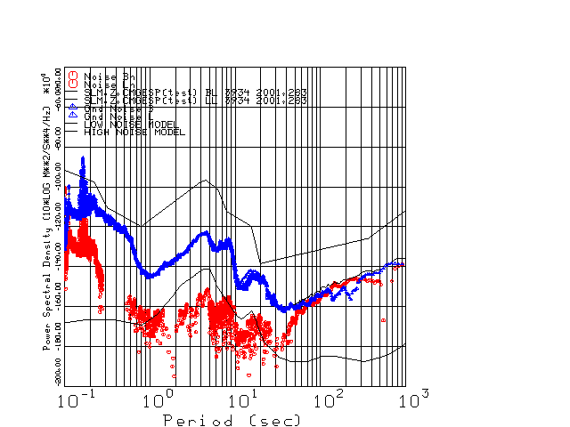 This page presents the results for Day 283 2001 and a direct comparison of the STS-2 to CMG3-ESP SN 3934 L channel). because of low teleseismic activity. 17 data segments are usually taken hourly starting at 0000 through 1700. 8192 time samples are used (~90 sec for 20 sps data stream) and 8192 sec for the 1 sps data stream. The noise results from the 20Hz and 1Hz data streams overlap at a 10 second period.