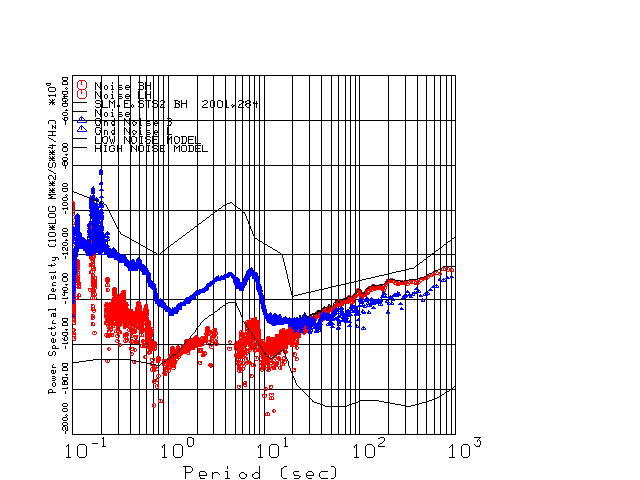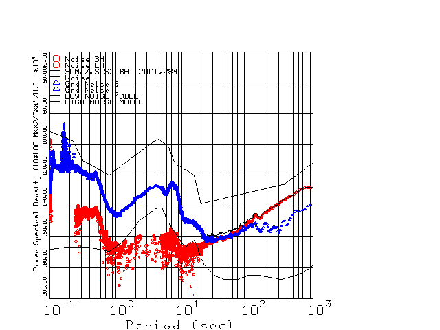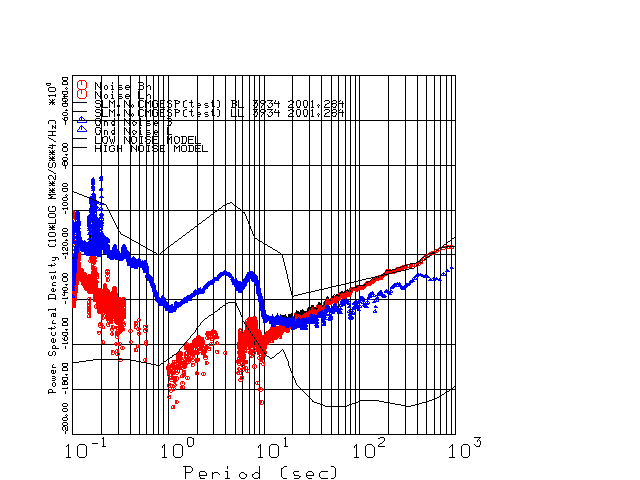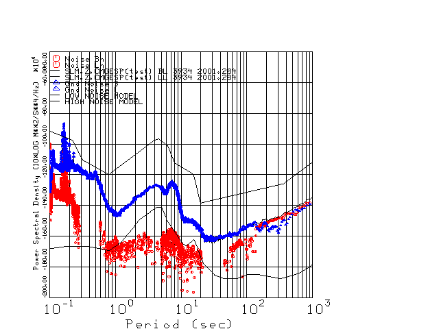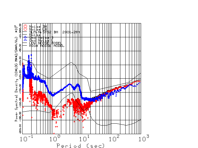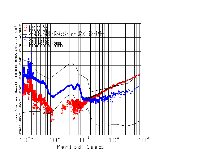 This page presents the results for Day 284 2001 and a direct comparison of the STS-2 to CMG3-ESP SN 3934 L channel). because of low teleseismic activity. 17 data segments are usually taken hourly starting at 0000 through 1700. 8192 time samples are used (~90 sec for 20 sps data stream) and 8192 sec for the 1 sps data stream. The noise results from the 20Hz and 1Hz data streams overlap at a 10 second period.