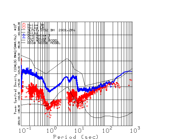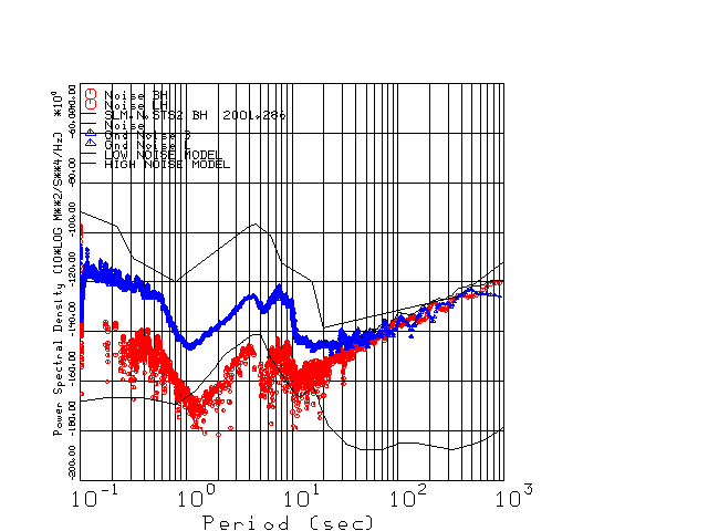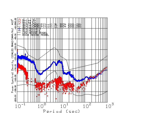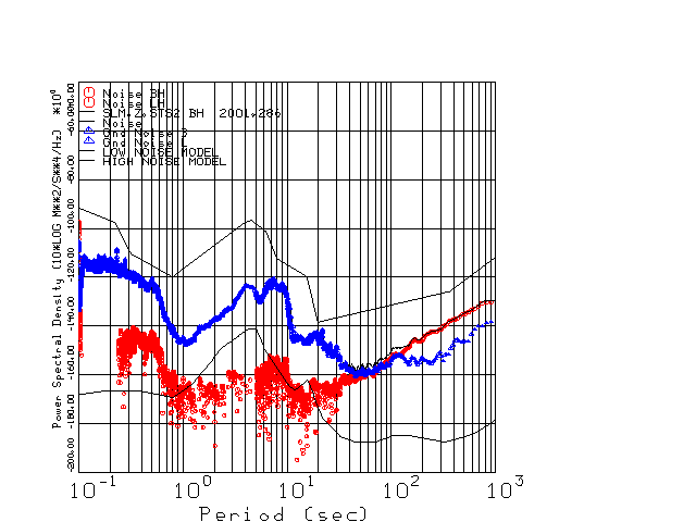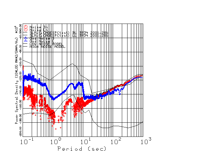 This page presents the results for Day 286 2001 and a direct comparison of the STS-2 to CMG3-ESP SN 3934 L channel). because of low teleseismic activity. 17 data segments are usually taken hourly starting at 0000 through 1700. 8192 time samples are used (~90 sec for 20 sps data stream) and 8192 sec for the 1 sps data stream. The noise results from the 20Hz and 1Hz data streams overlap at a 10 second period.