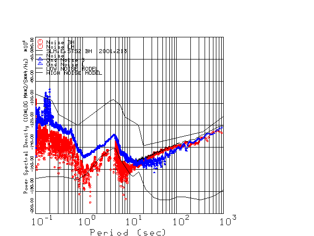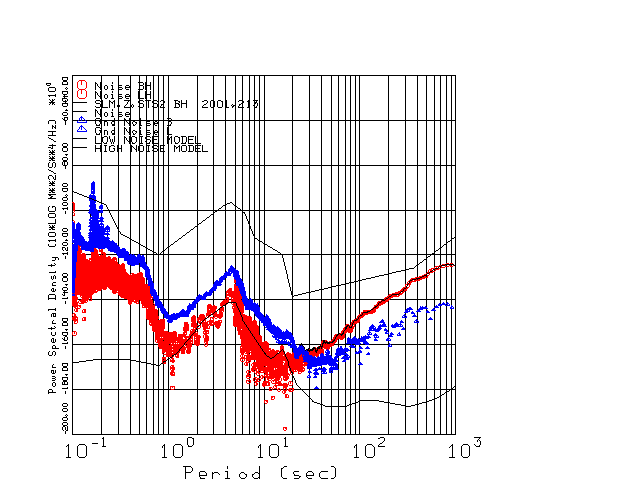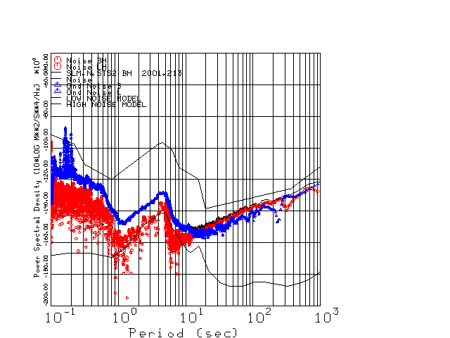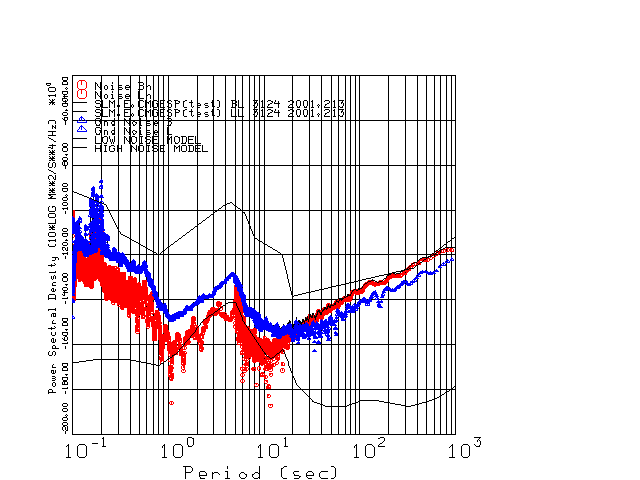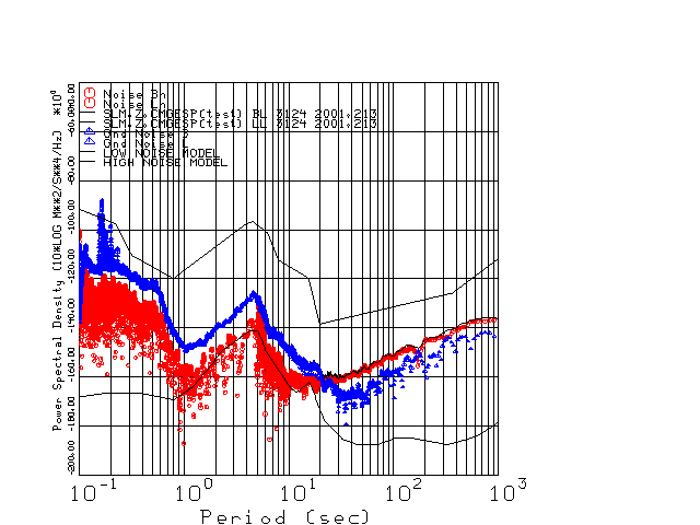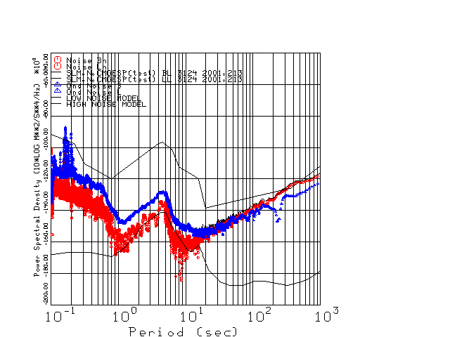 This page presents the results for Day 213 2001 and a direct comparison of the STS-2 to CMG3-ESP SN 3124 L channel). because of low teleseismic activity. 17 data segments are usually taken hourly starting at 0000 through 1700. 8192 time samples are used (~90 sec for 20 sps data stream) and 8192 sec for the 1 sps data stream. The noise results from the 20Hz and 1Hz data streams overlab at a 10 second period.