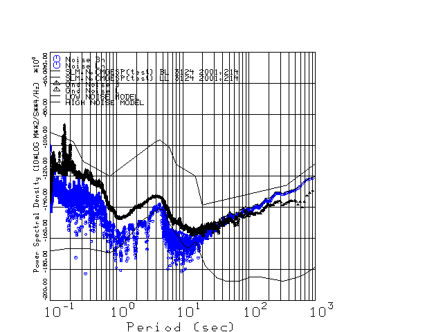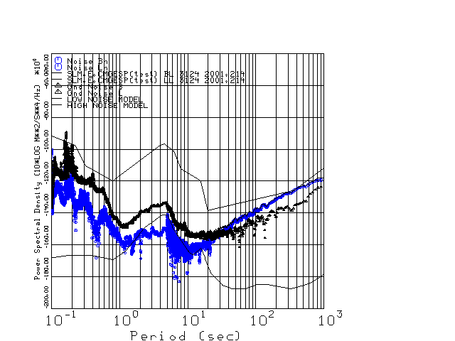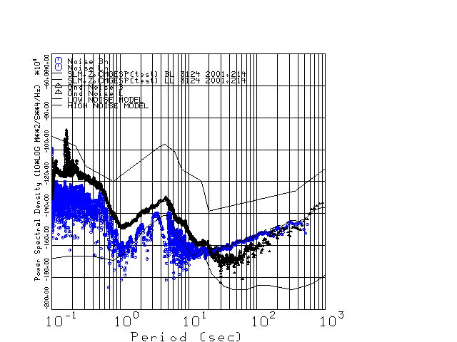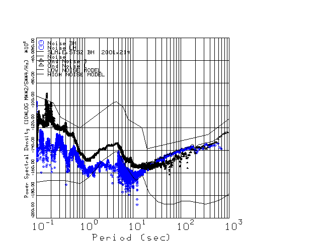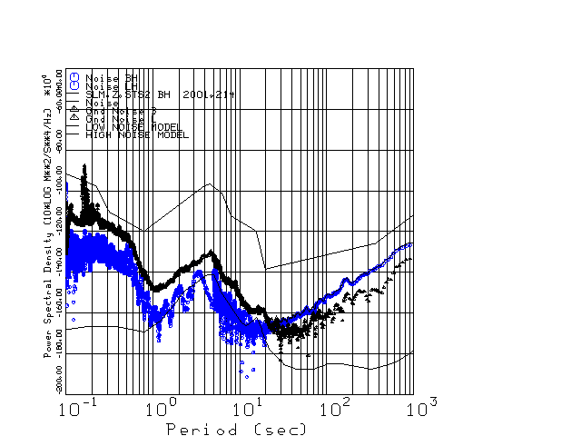 This page presents the results for Day 214 2001 and a direct comparison of the STS-2 to CMG3-ESP SN 3124 L channel). because of low teleseismic activity. 17 data segments are usually taken hourly starting at 0000 through 1700. 8192 time samples are used (~90 sec for 20 sps data stream) and 8192 sec for the 1 sps data stream. The noise results from the 20Hz and 1Hz data streams overlab at a 10 second period.