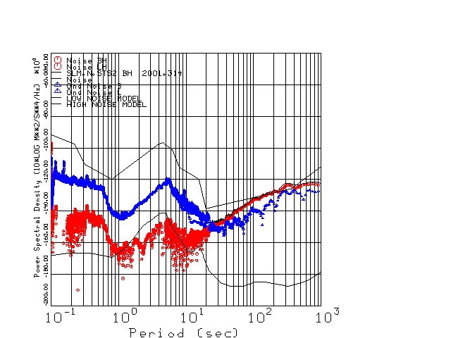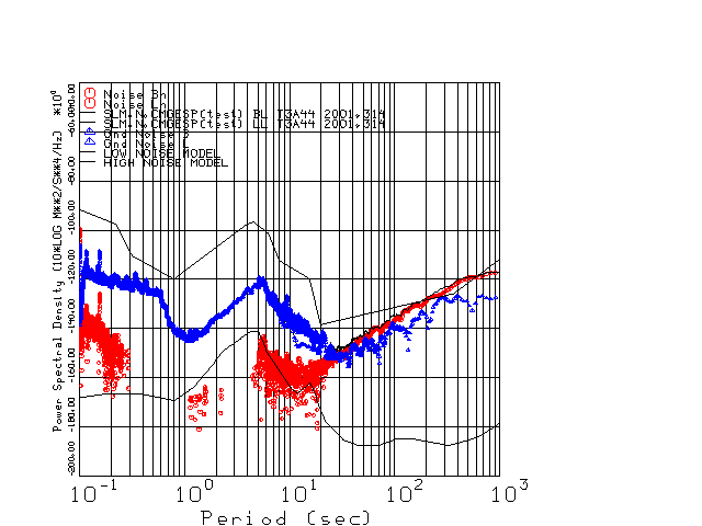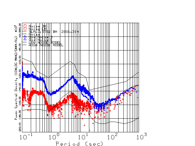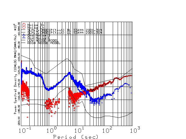 This page presents the results for Day 314 2001 and a direct comparison of the STS-2 to CMG3-ESP SN T3A44 L channel). because of low teleseismic activity. 17 data segments are usually taken hourly starting at 0000 through 1700. 8192 time samples are used (~90 sec for 20 sps data stream) and 8192 sec for the 1 sps data stream. The noise results from the 20Hz and 1Hz data streams overlap at a 10 second period.