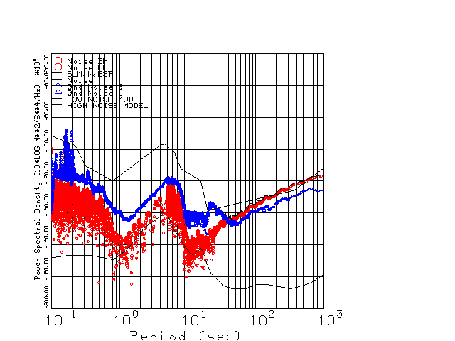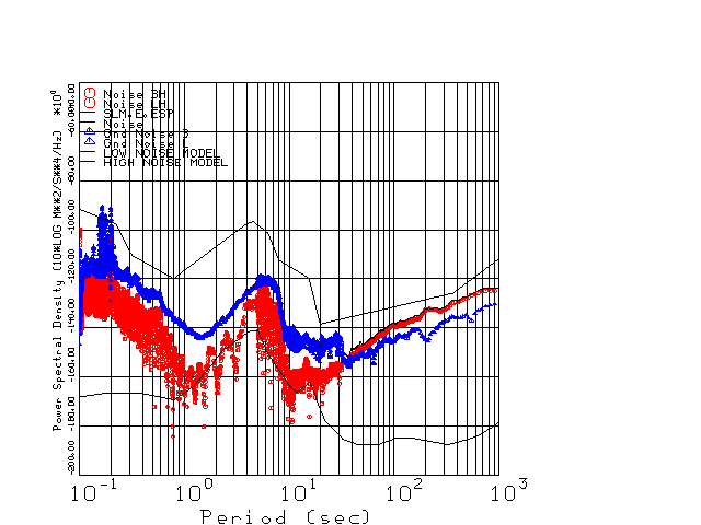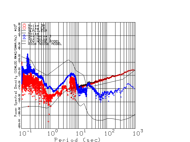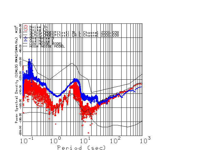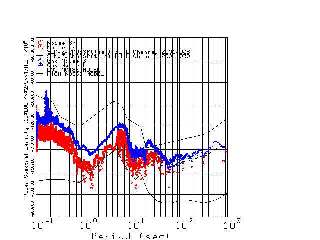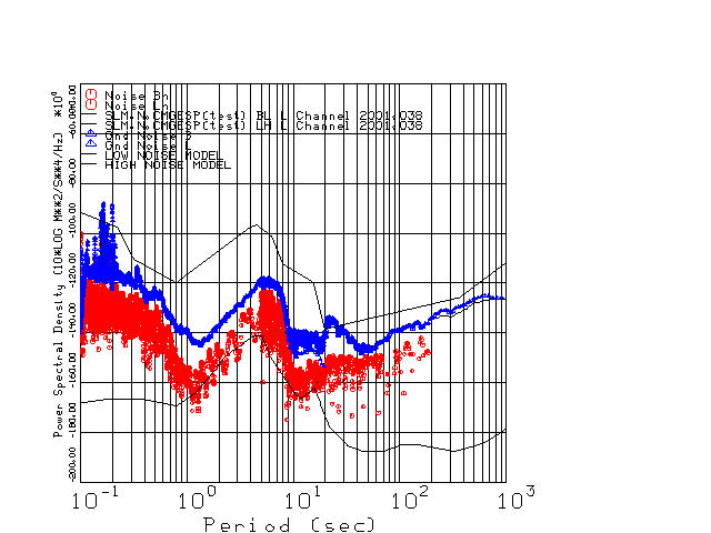 This page presents the results for Day 038 2001 and a direct comparison of CMG3-ESP SN 3163 L channel) to CMG3-ESP SN 3164 (H channel). Day 038 was chosen because of low teleseismic activity. 17 data segments are taken hourly starting at 0000 through 1700. 8192 time samples are used (~90 sec for 20 sps data stream) and 8192 sec for the 1 sps data stream. The noise results from the 20Hz and 1Hz data streams overlab at a 10 second period.