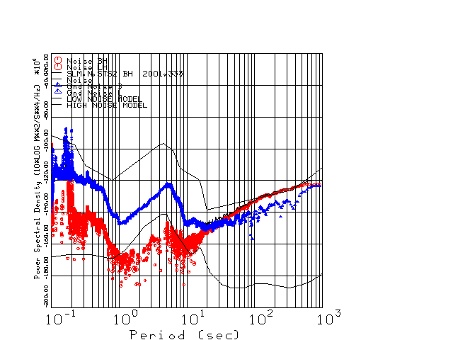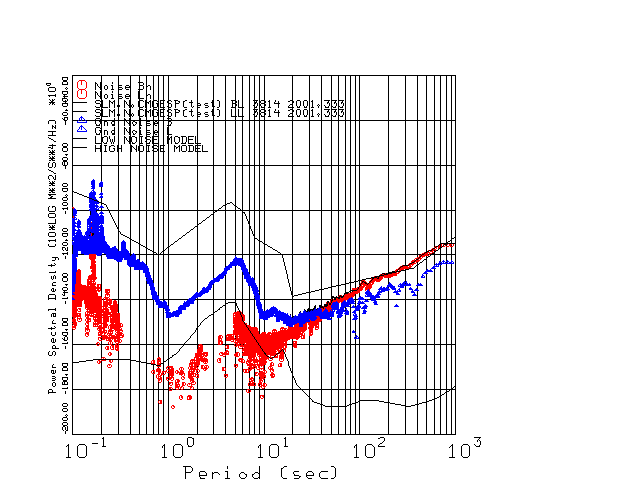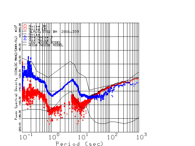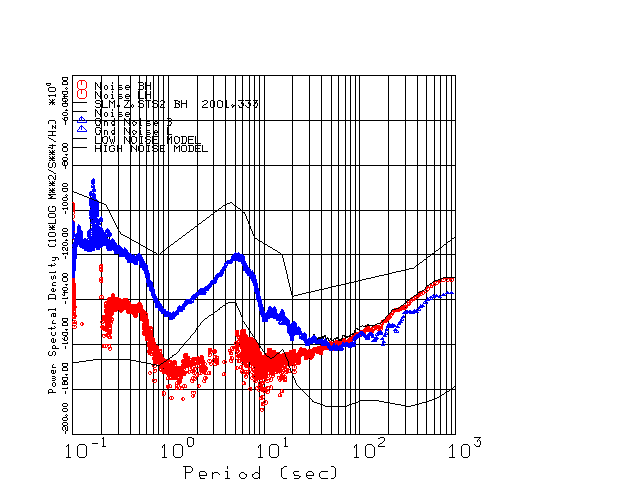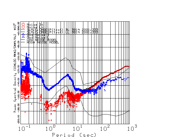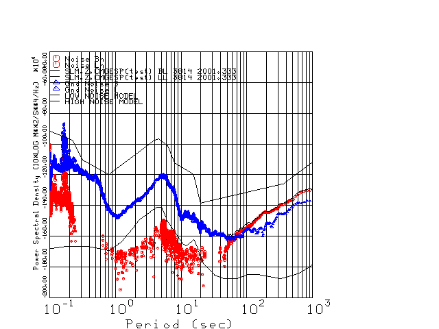 This page presents the results for Day 333 2001 and a direct comparison of the STS-2 to CMG3-ESP SN 3814 L channel). because of low teleseismic activity. 17 data segments are usually taken hourly starting at 0000 through 1700. 8192 time samples are used (~90 sec for 20 sps data stream) and 8192 sec for the 1 sps data stream. The noise results from the 20Hz and 1Hz data streams overlap at a 10 second period.