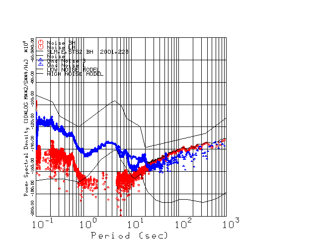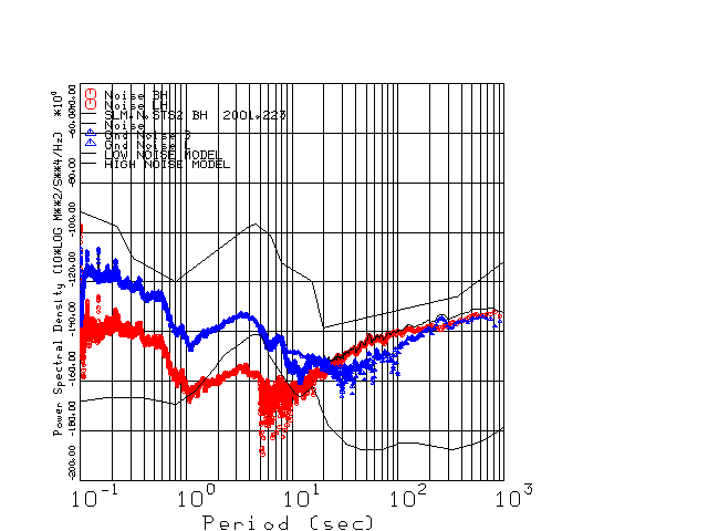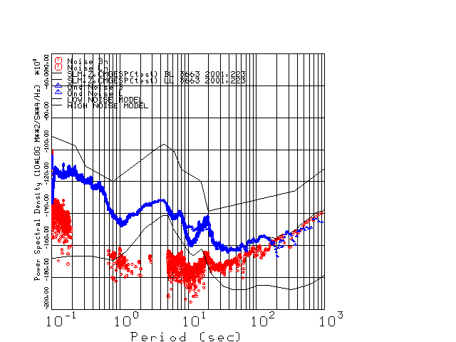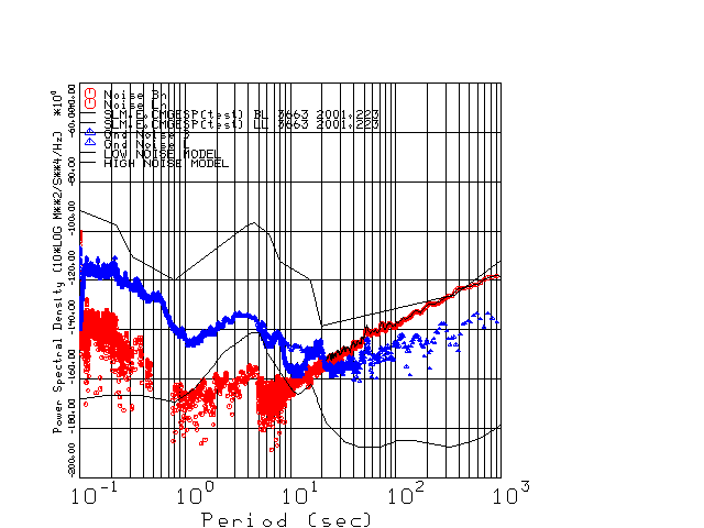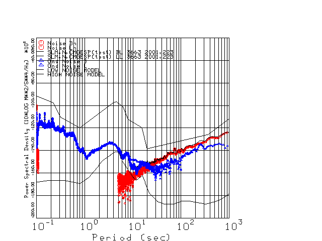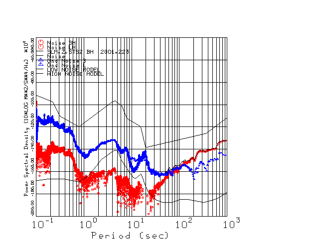 This page presents the results for Day 223 2001 and a direct comparison of the STS-2 to CMG3-ESP SN 3663 L channel). because of low teleseismic activity. 17 data segments are usually taken hourly starting at 0000 through 1700. 8192 time samples are used (~90 sec for 20 sps data stream) and 8192 sec for the 1 sps data stream. The noise results from the 20Hz and 1Hz data streams overlab at a 10 second period.