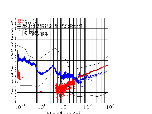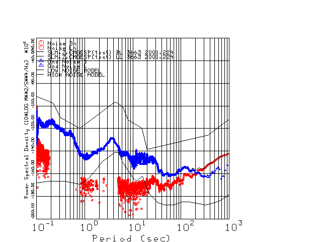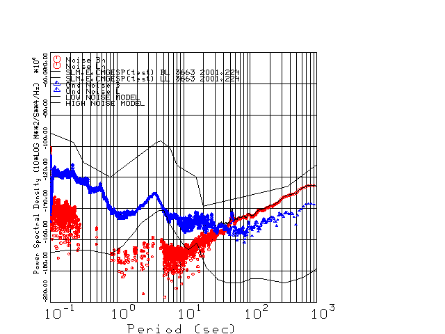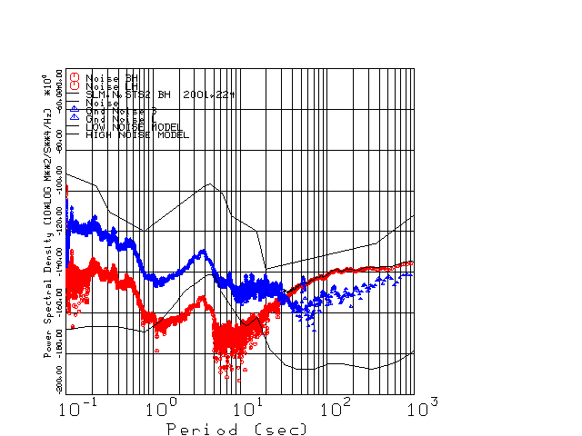 This page presents the results for Day 224 2001 and a direct comparison of the STS-2 to CMG3-ESP SN 3663 L channel). because of low teleseismic activity. 17 data segments are usually taken hourly starting at 0000 through 1700. 8192 time samples are used (~90 sec for 20 sps data stream) and 8192 sec for the 1 sps data stream. The noise results from the 20Hz and 1Hz data streams overlap at a 10 second period.