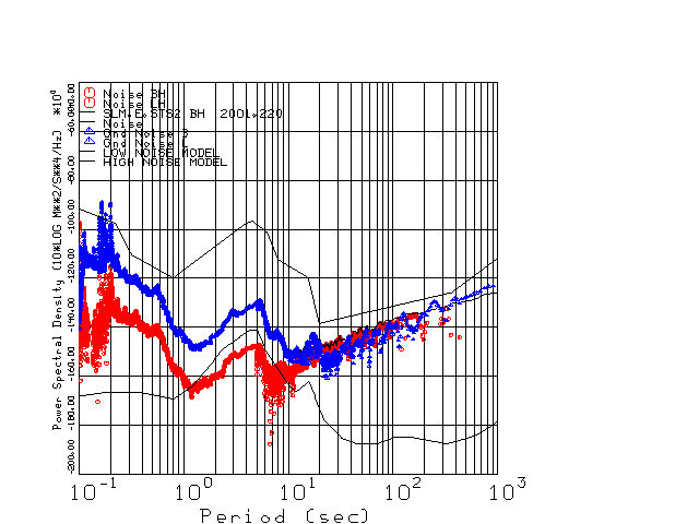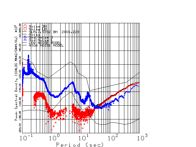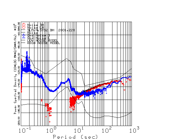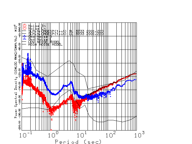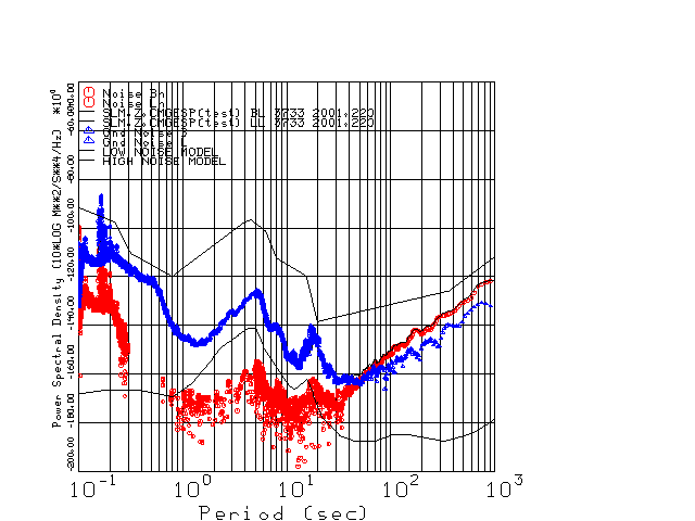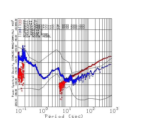 This page presents the results for Day 220 2001 and a direct comparison of the STS-2 to CMG3-ESP SN 3733 L channel). because of low teleseismic activity. 17 data segments are usually taken hourly starting at 0000 through 1700. 8192 time samples are used (~90 sec for 20 sps data stream) and 8192 sec for the 1 sps data stream. The noise results from the 20Hz and 1Hz data streams overlab at a 10 second period.