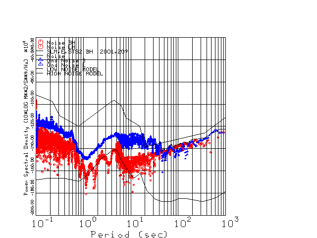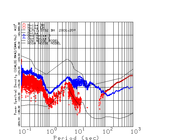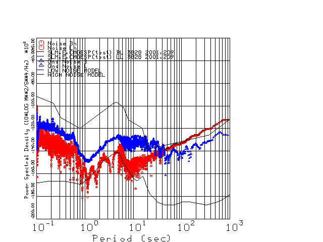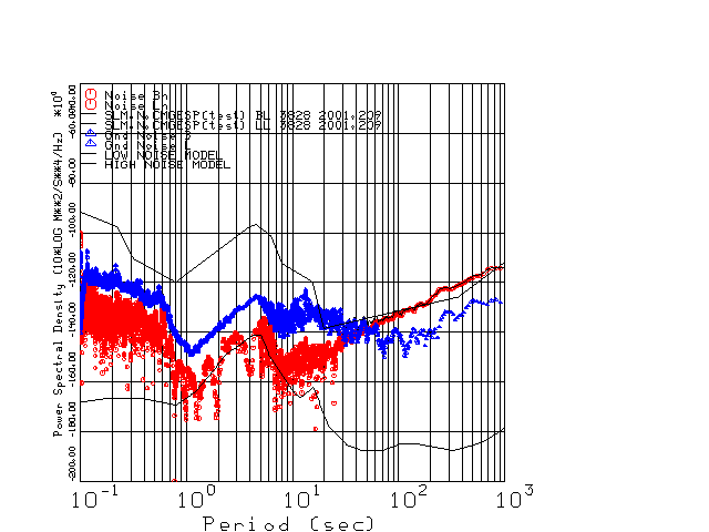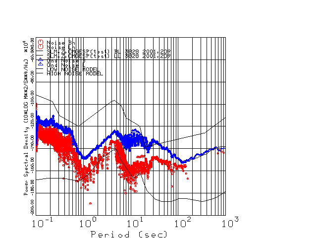 This page presents the results for Day 209 2001 and a direct comparison of the STS-2 to CMG3-ESP SN 3828 L channel). because of low teleseismic activity. 17 data segments are usually taken hourly starting at 0000 through 1700. 8192 time samples are used (~90 sec for 20 sps data stream) and 8192 sec for the 1 sps data stream. The noise results from the 20Hz and 1Hz data streams overlab at a 10 second period.