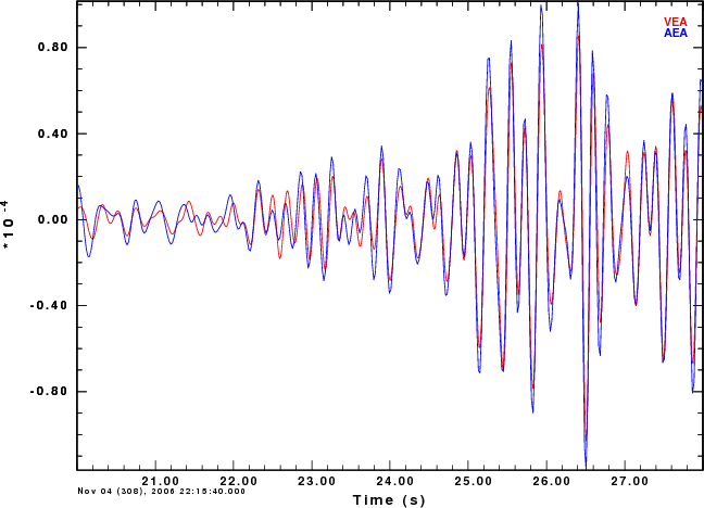 The comparison plots showing the bandpass filtered Z, N ane E traces (2 - 6 Hz band) are shown in the figures below: