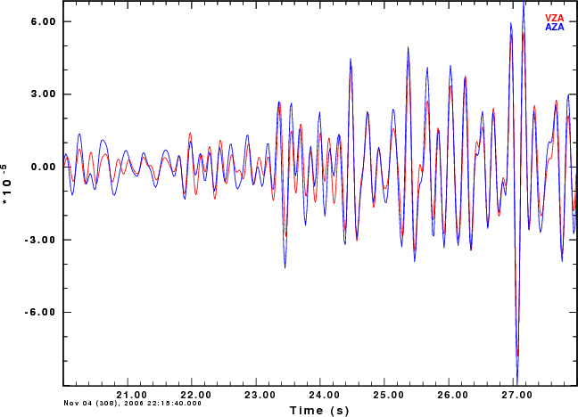 The data processing consisted of converting the response to acceleration sensitivity in units of meters/s/s using evalresp. The signals were deconvolved to ground deisplacement in units of m/s/s using the following script: